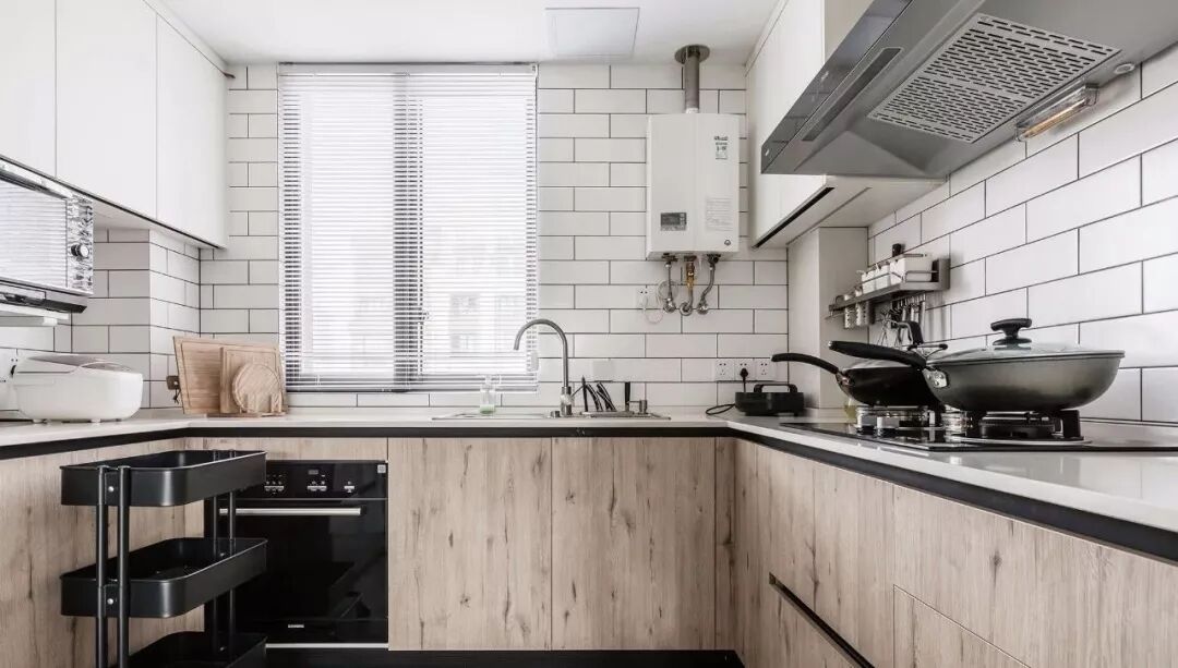 ▲ 厨房空间以纯净的白色面包砖贯穿其中,木质的橱柜营造出温馨的视觉感受,以灰色砖贴地,耐脏且有设计美学