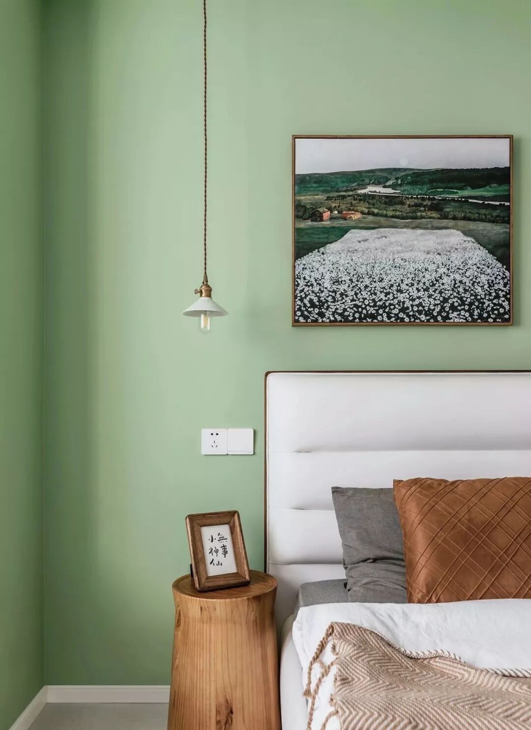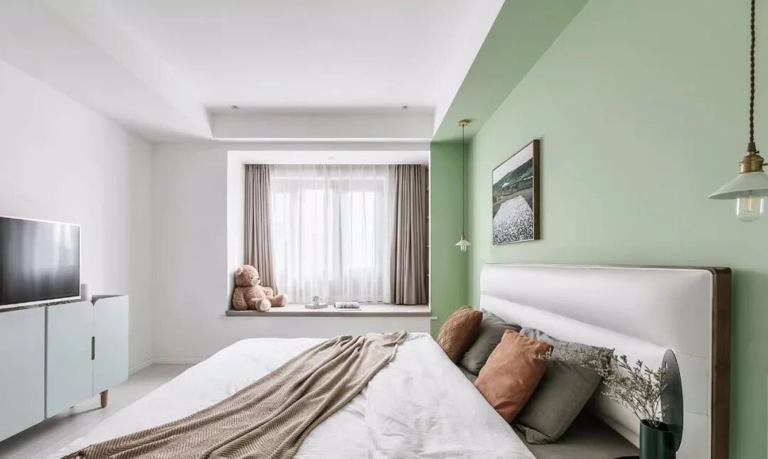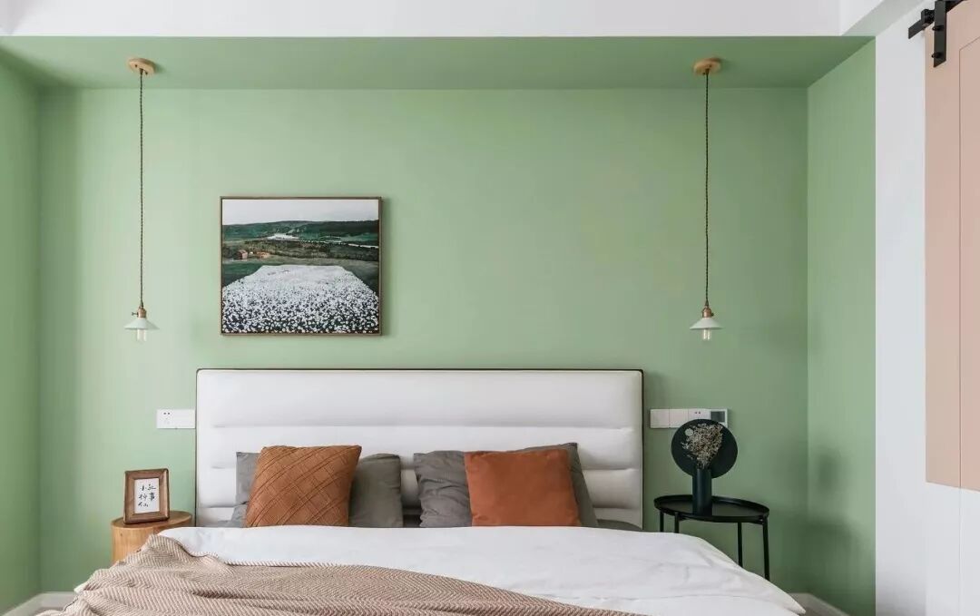 ▲ 绿色背景对应床尾的莫兰迪色电视柜,在大面积留白的卧室中倍感清新