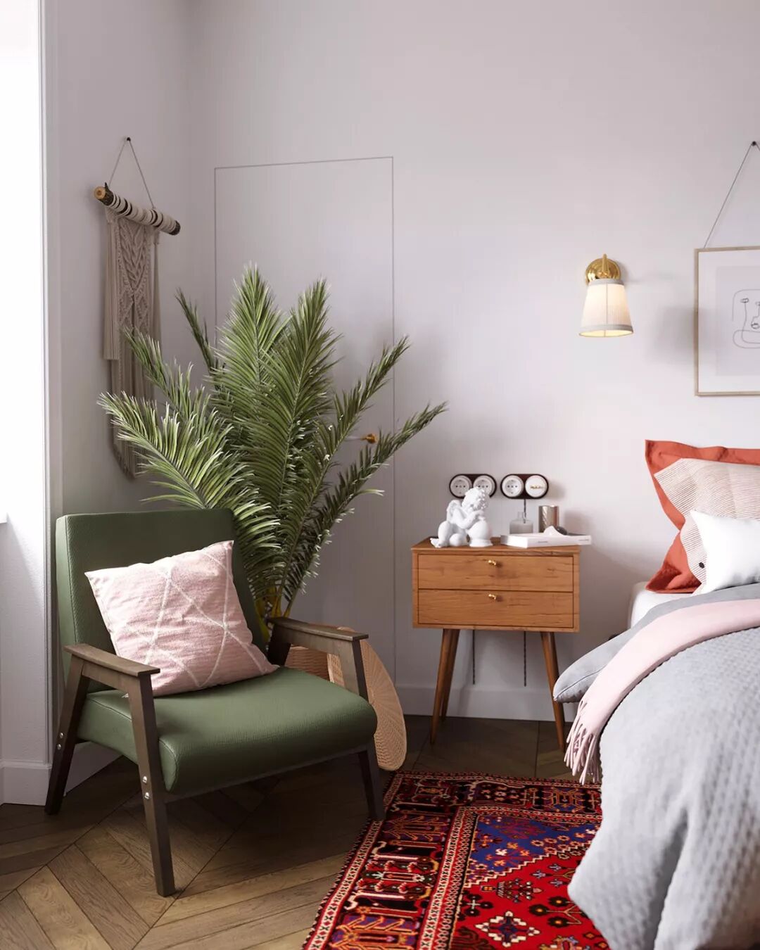绿色 卧室椅子与客厅的重点椅子相匹配。它与填补后面角落的既定房屋植物的叶子融为一体。