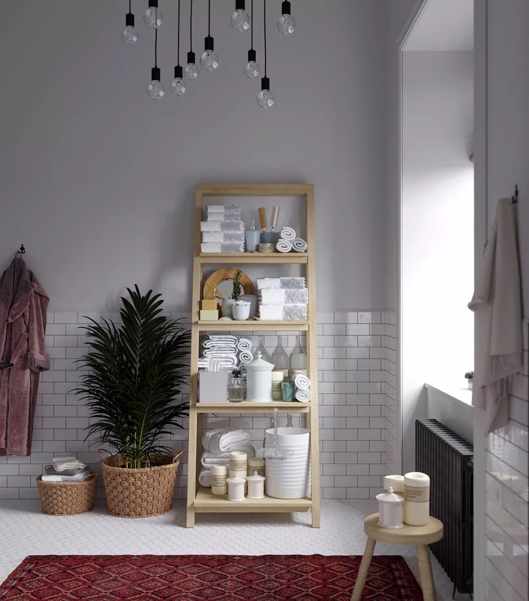 浴室拥有与其他家庭相同的不拘一格的斯堪的纳维亚氛围。红色区域地毯在经典木质梳妆台前面的冷瓷砖地板上温暖。