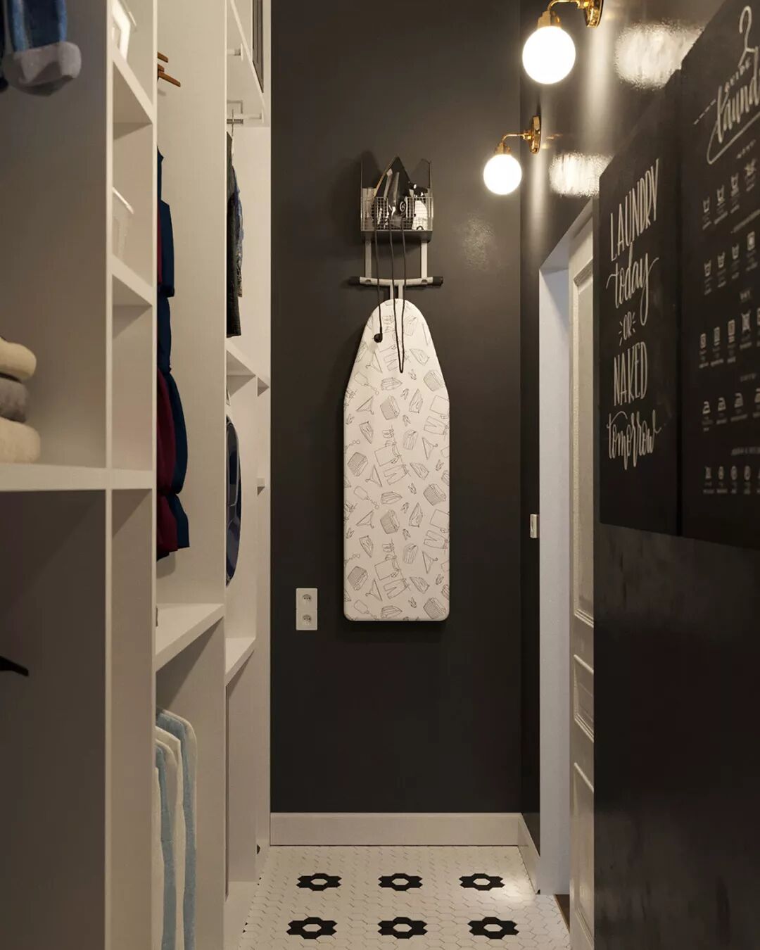 洗衣房的墙壁涂成黑色,熨衣板支架将其中一个小墙转变为有用的存储点。