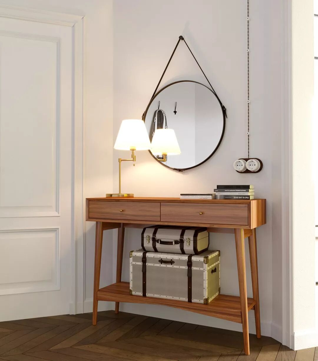 大厅桌子矗立在入口门旁,在一个挂着皮革表带的圆形镜子下方。