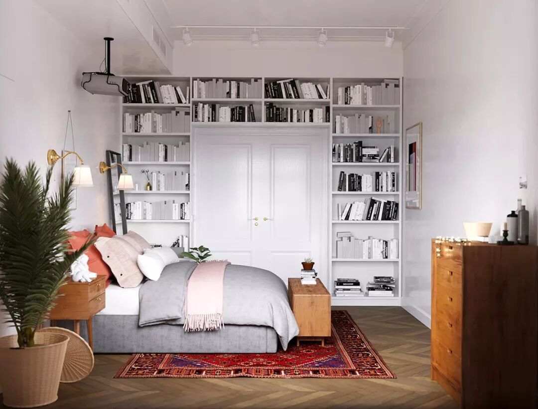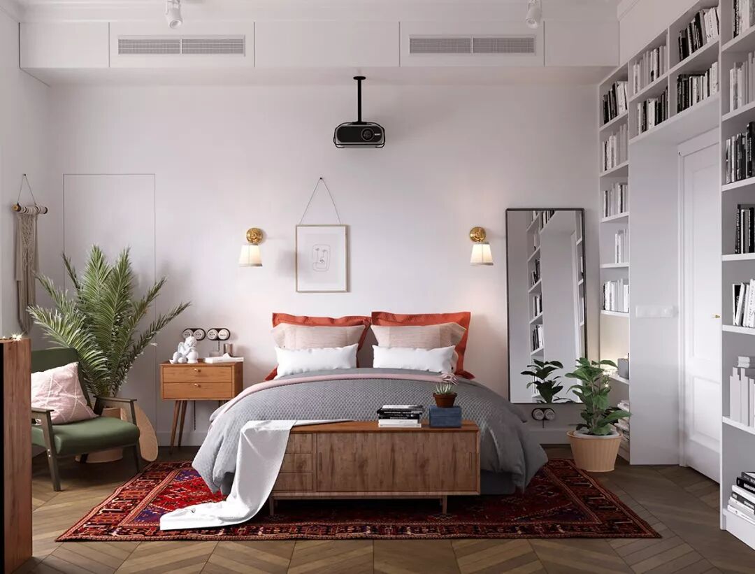 在卧室书架是一个定制的设计,爬上卧室门的两边,并在顶部连接,使得大部分的垂直存储空间。高耸的架子上摆满了一个家庭图书馆,等待着睡前阅读。然而,投影仪单元也利用床对面的光滑白墙等待准备播放电影。
