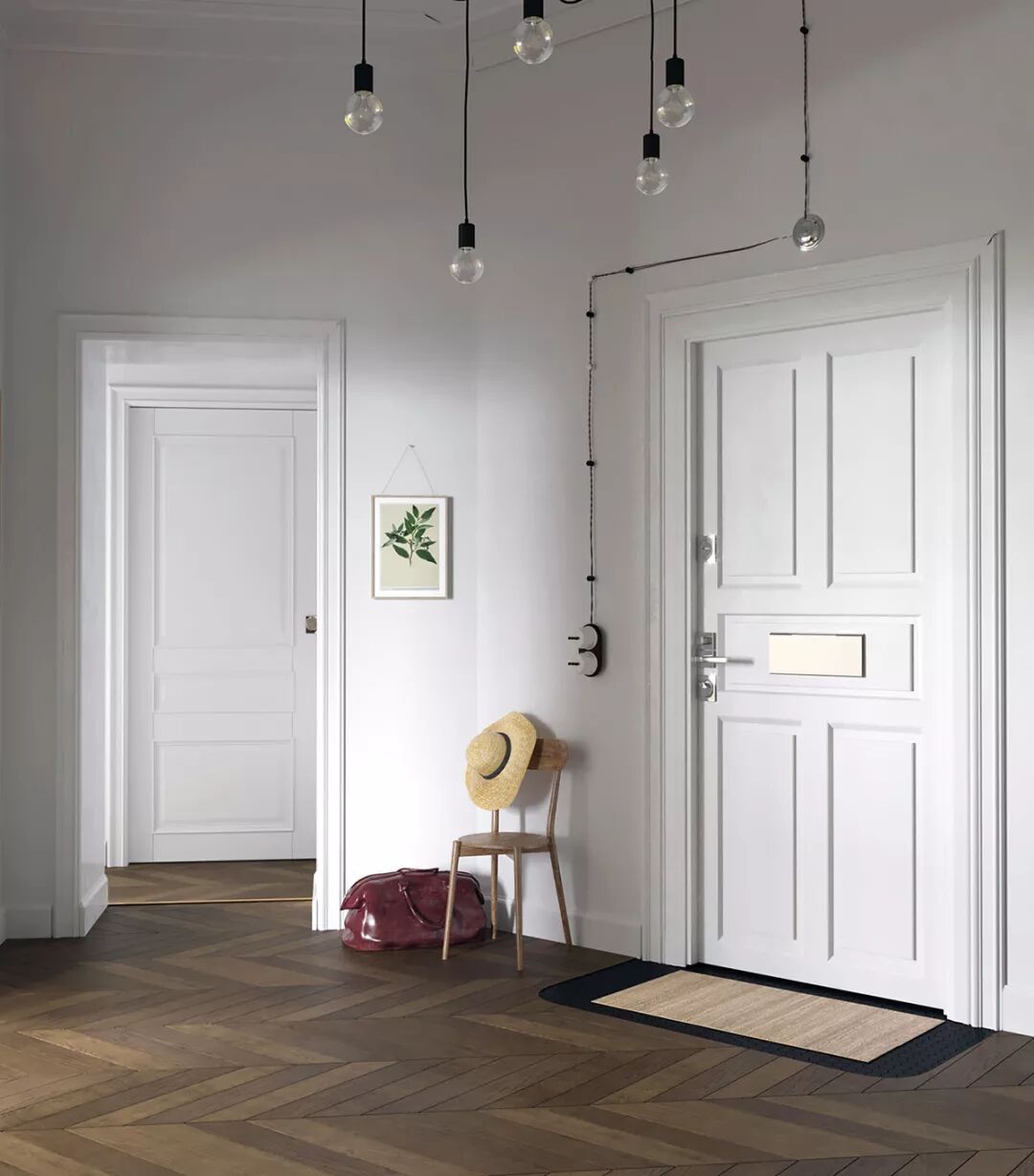 在这个房间里,木地板被几何白色瓷砖取代。门口设置了黑色地理瓷砖图案。