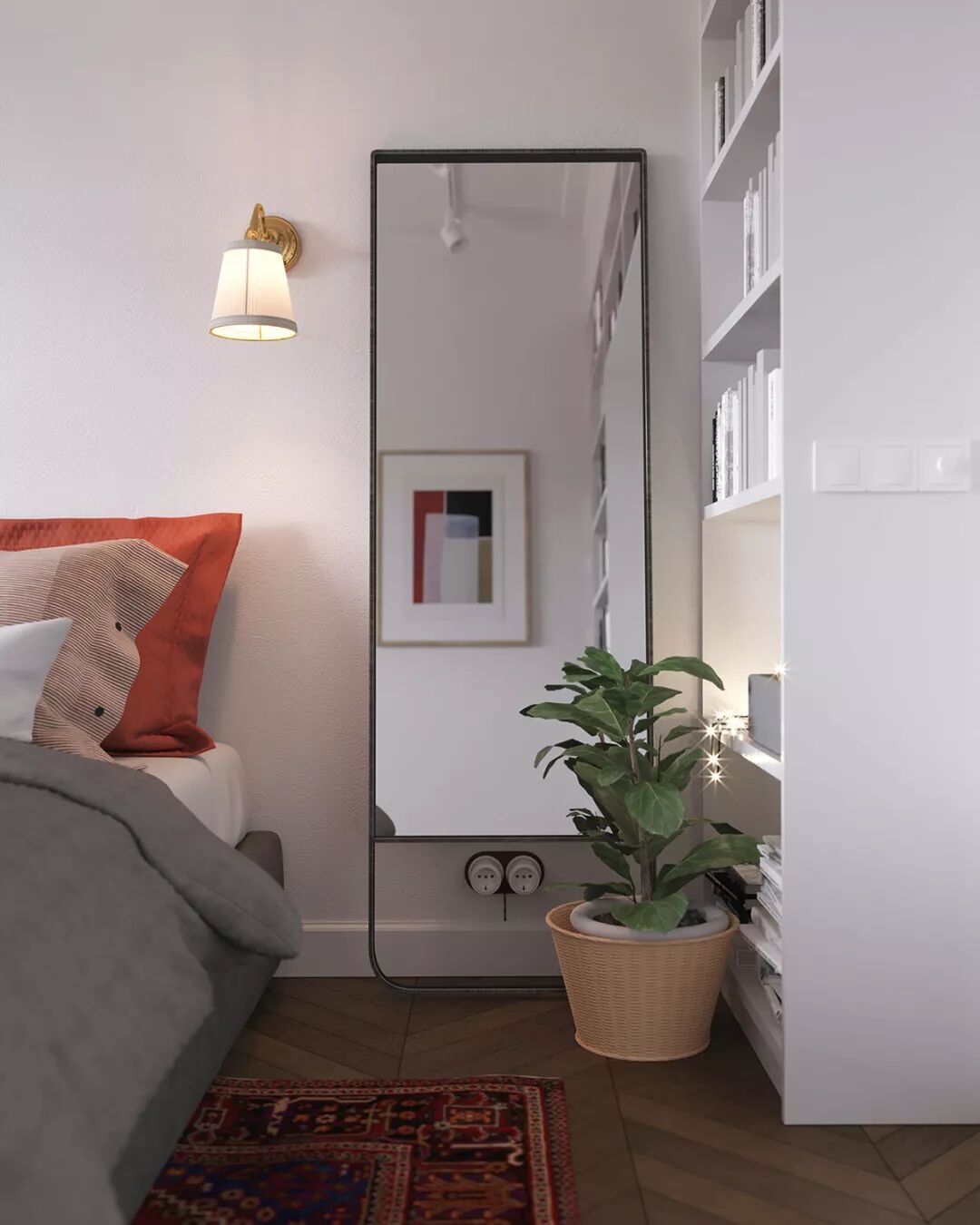 一个传统的地毯温暖的地板在脚下,橙色,红色和钴蓝色的色调。两个橙色枕头将地毯的颜色与床相连,而木制家具的橙色调则将其带到房间的正前方。