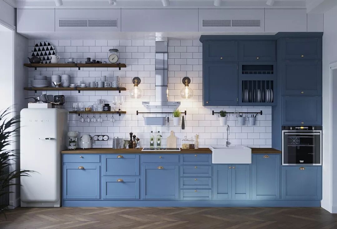 木制开放式厨房搁架和配套的台面与蓝色厨房形成鲜明对比。