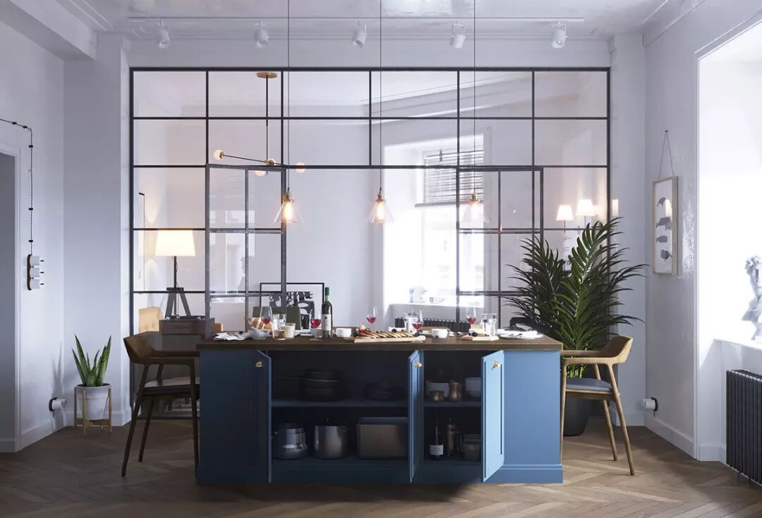 厨房为开放式厨房,厨房餐厅通过内部玻璃墙和双层玻璃门与休息室隔开。