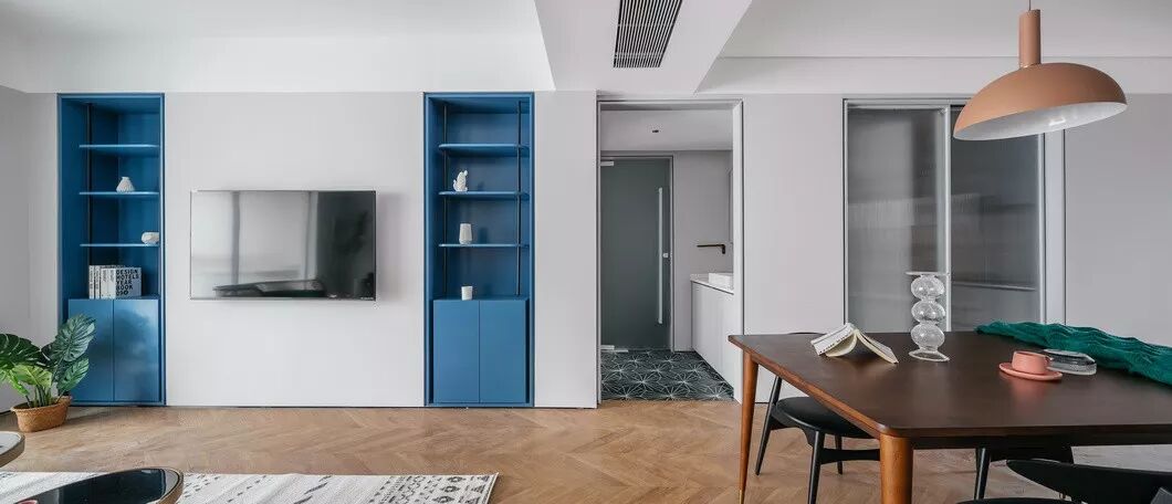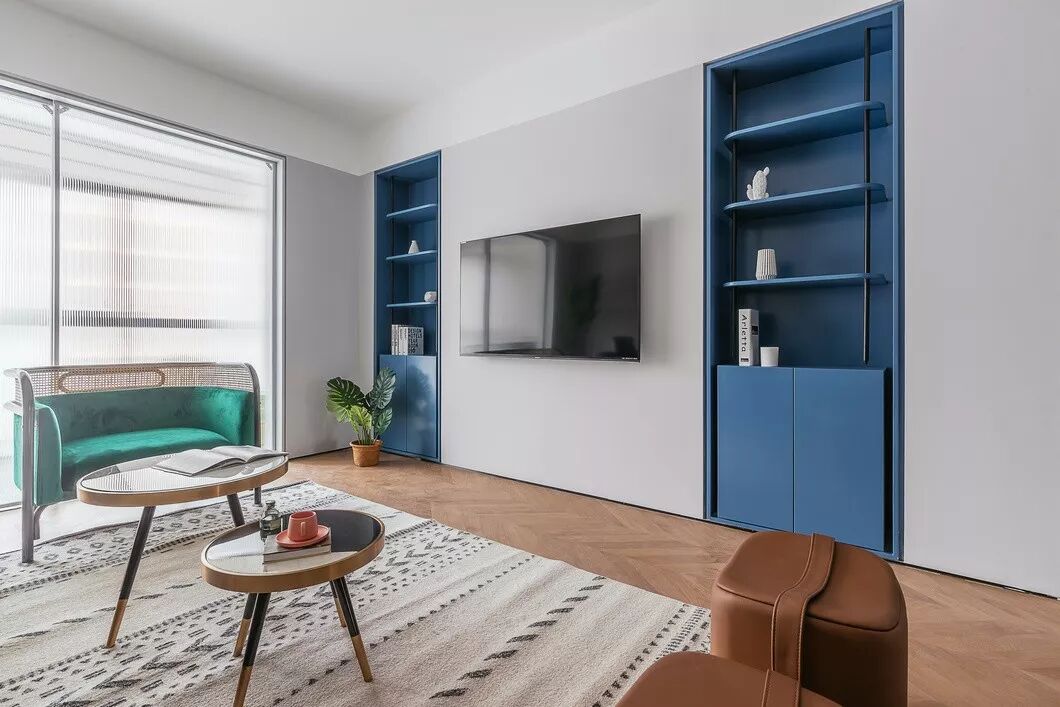 电视背景墙延续简约的风格设计,内嵌式蓝色储物柜特意设计成对称样式,达到平衡整个区域重心的目的。纯色以其特有的明亮和澄净,给人一目了然的舒心。