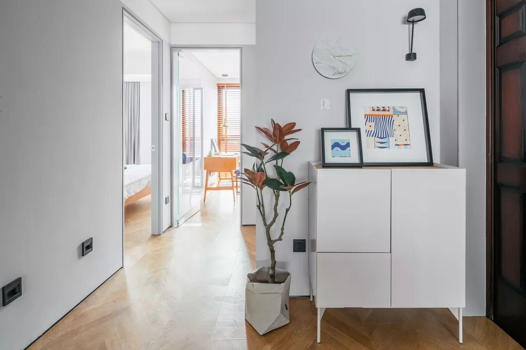 浅系藕粉色鞋柜精巧,线条纤细却有力,足够安放进出门的鞋履;右侧柜体内部特别设计了衣架,让“隔夜衣”有了很好的去处。新式大理石面板的时钟极具创意,配上设计师灵感乍现DIY的装饰画,清新淡雅,是初遇的时刻。
