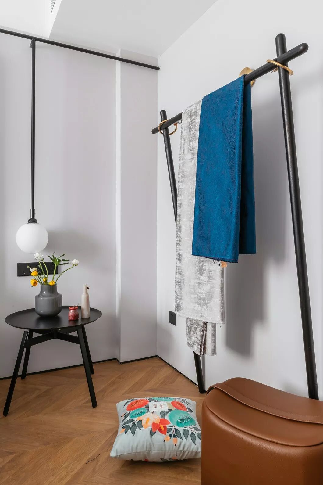 轨道在保证安全和质量的前提下,特别定制了细线条以求统一设计风格。轨道一侧DIY了三个挂衣钩,挂上衣物和包包又是一番风景。
