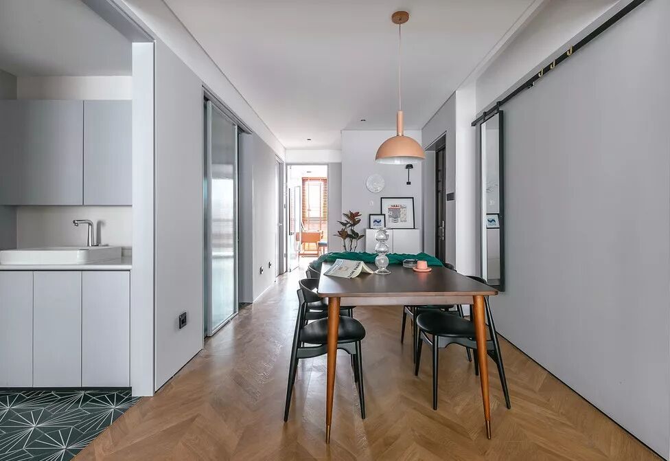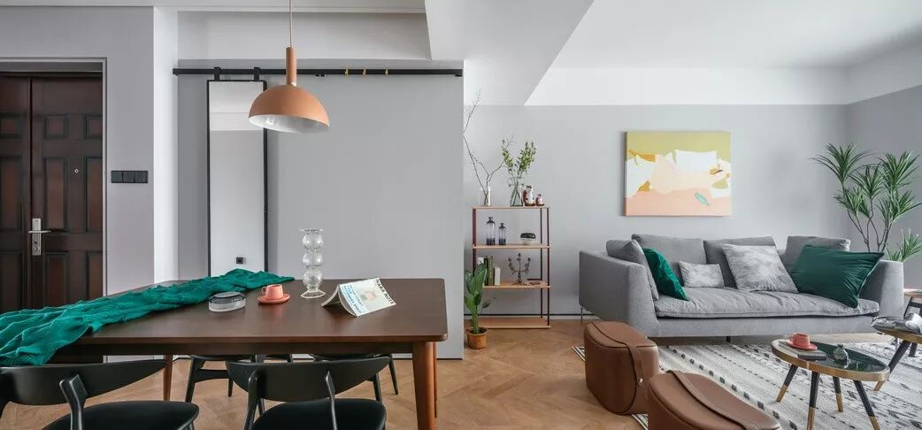 餐厅,少见的散逸着浪漫自由的气息。门厅面积不够,设计师大胆地把全身镜融入移动轨道安置在餐厅墙面上,可根据实际生活中的使用需要随意移动,强电箱刚好被完美遮挡。