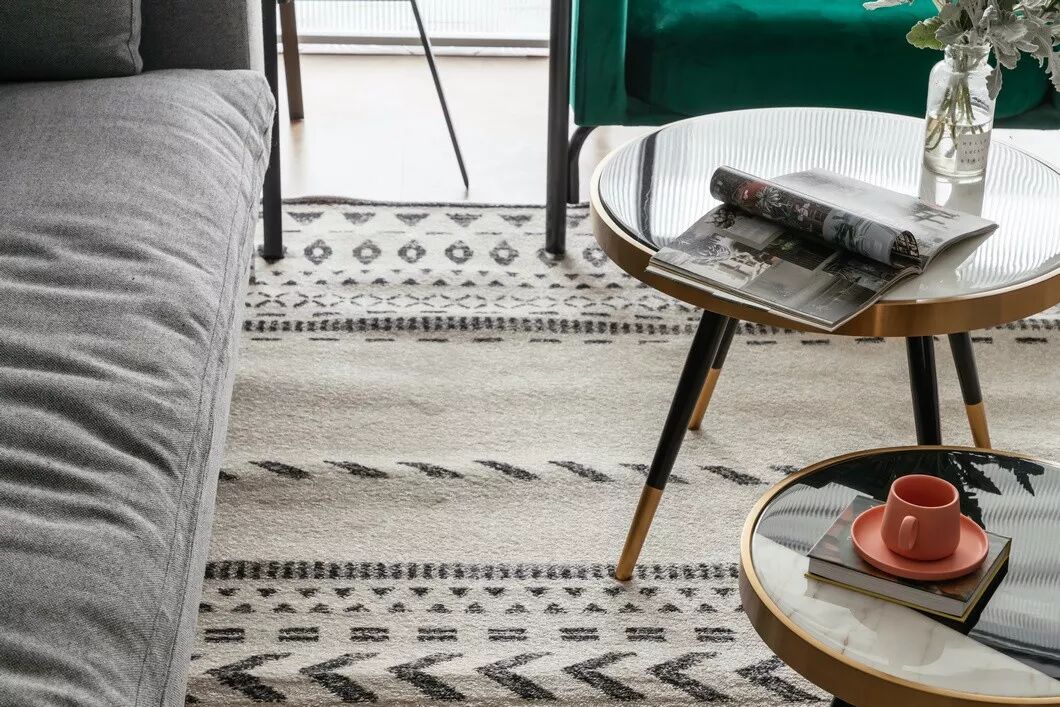 米色短绒几何图案地毯清爽整洁,且不易藏污垢和灰尘。皮质坐凳、黑白撞色金属框茶几、青葱的绿植、抽象的装饰画,每一个细节都饱含对生活的热情和对艺术的欣赏。