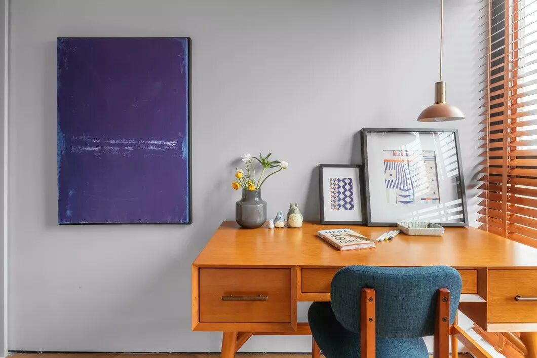 在蓝紫和橘黄的冷暖色碰撞下,是精致与活力的并存,就连书桌上的装饰画也在悄悄倾诉着这两种颜色的细节。