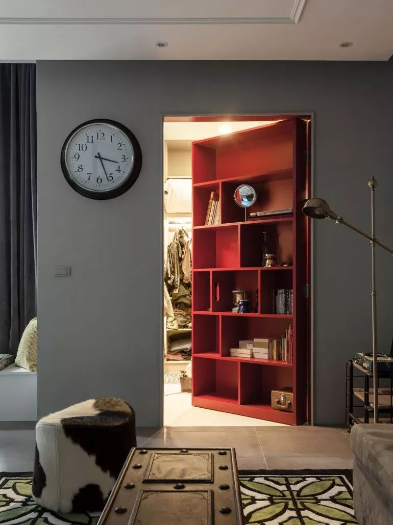 设计平开隐形门时可以将门与墙面设计成同种花纹、壁纸、墙漆来达到完美隐藏的效果;另外也可以做成储物架、书架等来进行掩护。