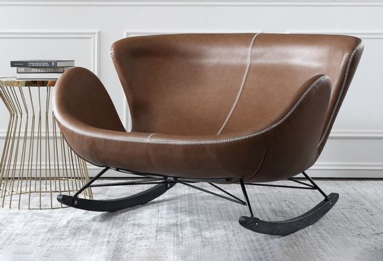 酷、有趣、复古、工业、舒适等矛盾的特性在这张椅子上结合得平衡又奇妙,以至于看一眼就让人印象深刻。细腻的皮质纹理,散发出厚重的品质感。而椅子脚却采用深色轻盈的铁艺,缓和了这份厚重感,显得轻盈又有趣。适合两个人的宽敞空间,坐下来,轻轻的摇着,感受着椅子传到出来有趣又很酷的世界。