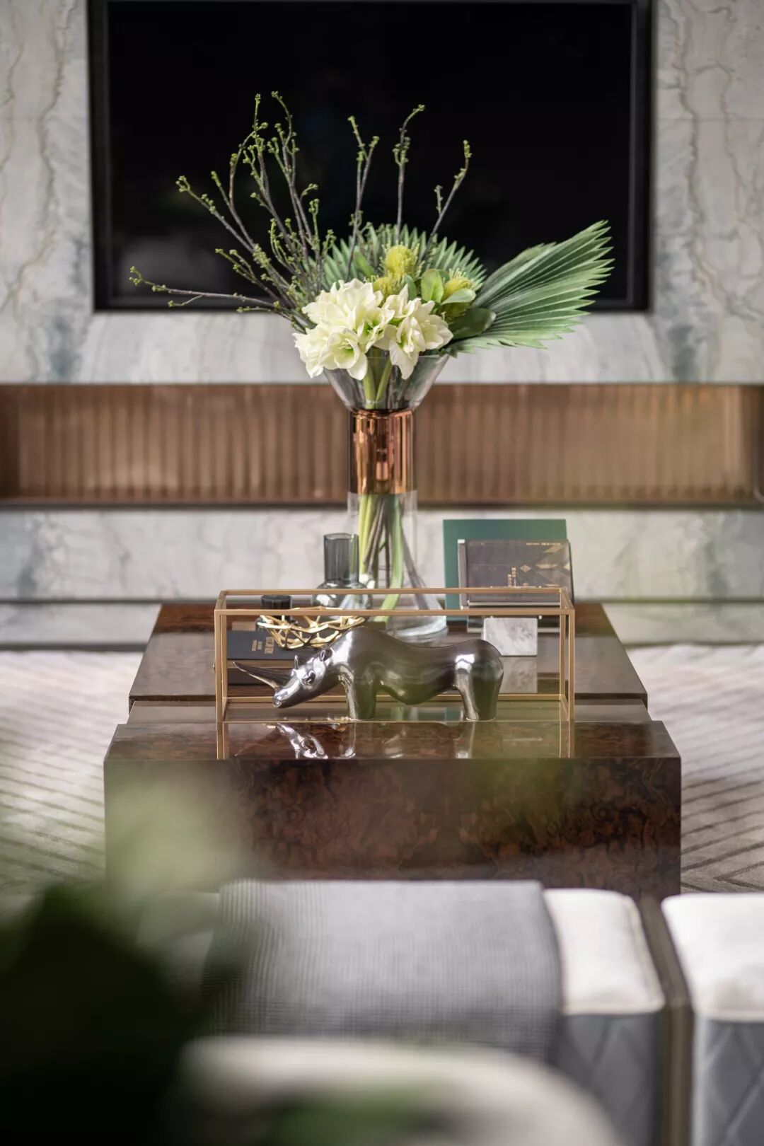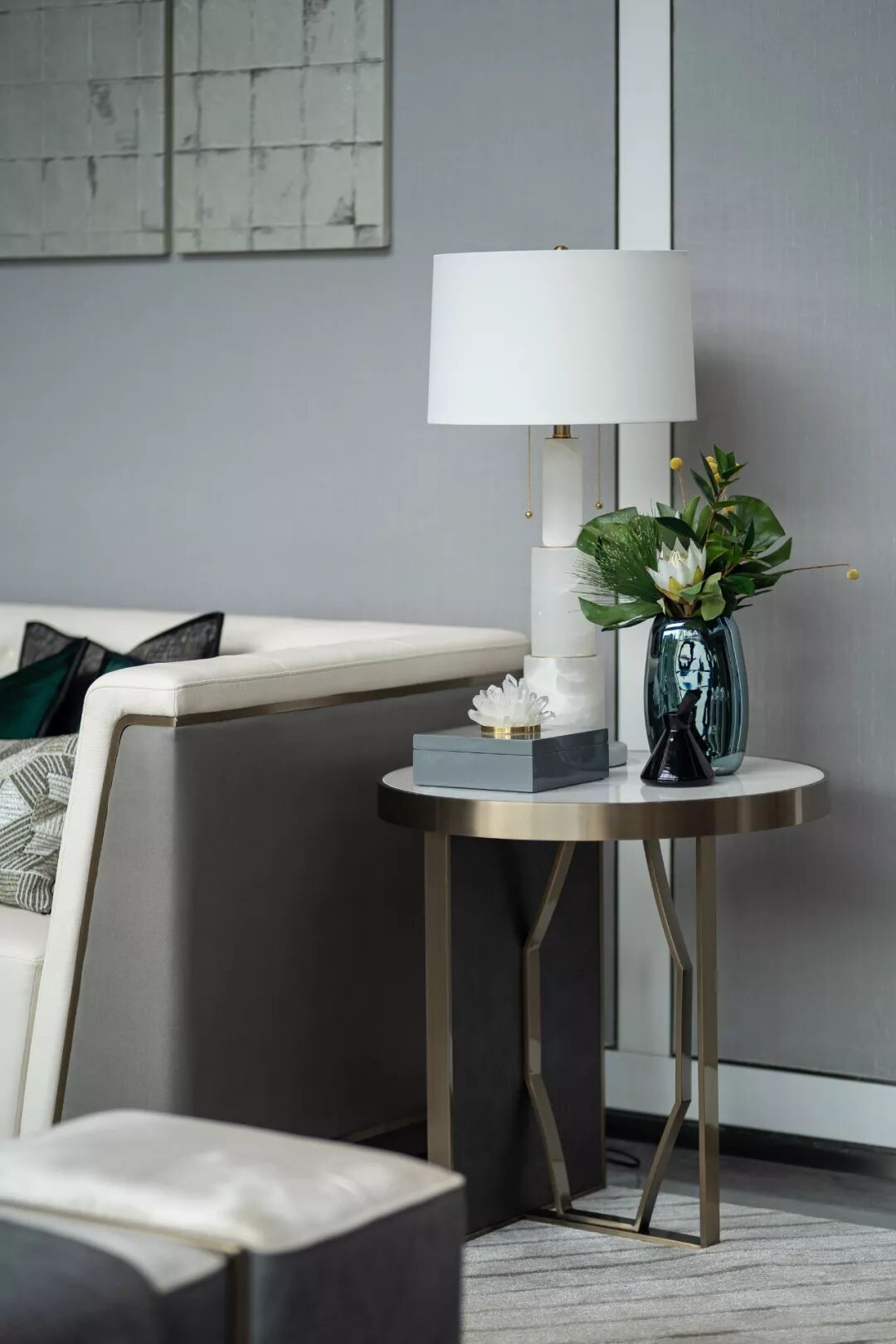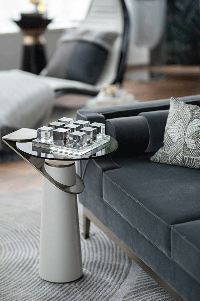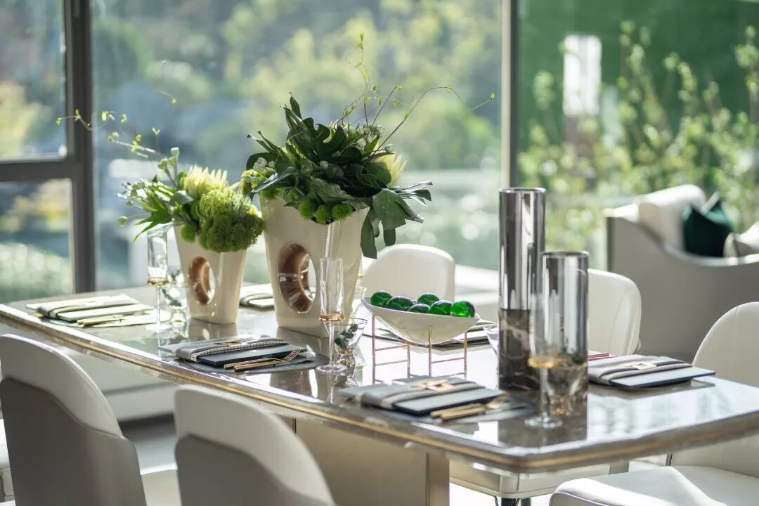 时尚、精致、简约,是属于菁英居所的共性特征。深邃迷人的祖母绿色,点缀在大片的鸽子灰色调之上,金属、皮质、大理石、水晶灯材质互作搭配,呈现时尚摩登的观感,亦不失开放性社交空间的气质。