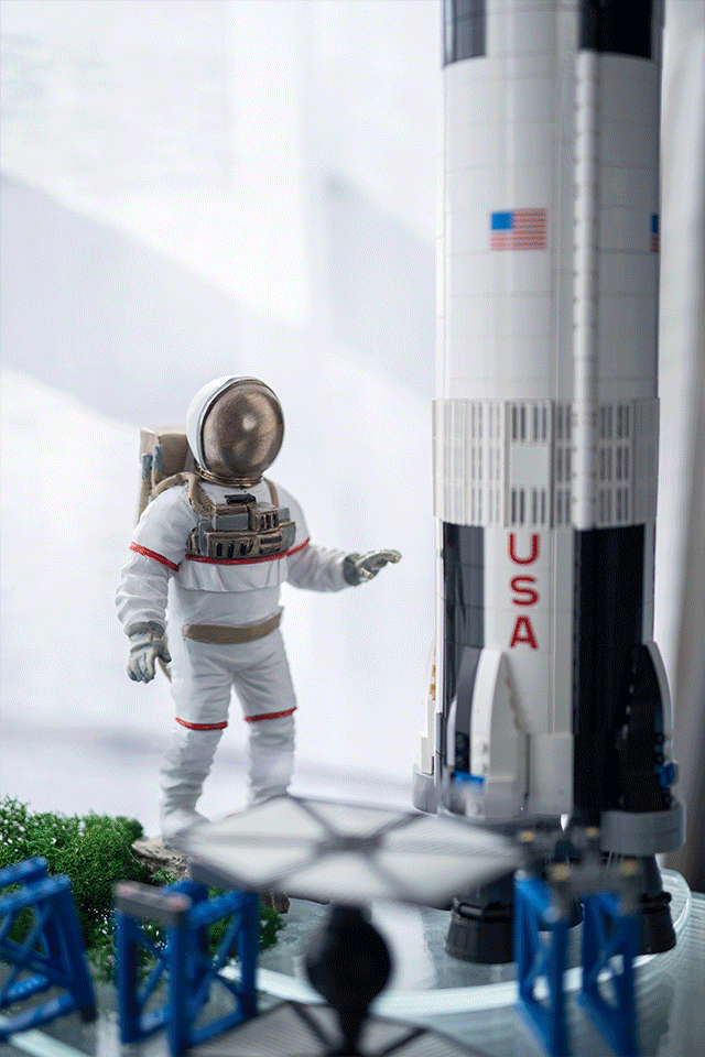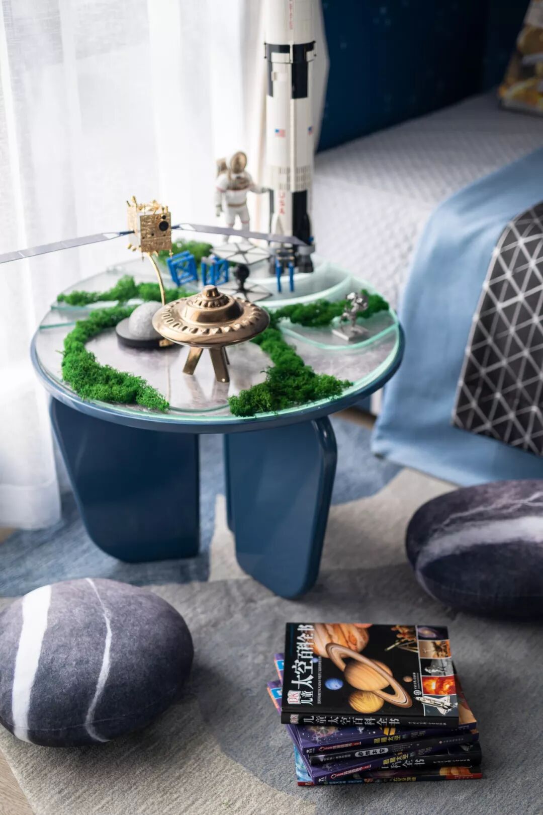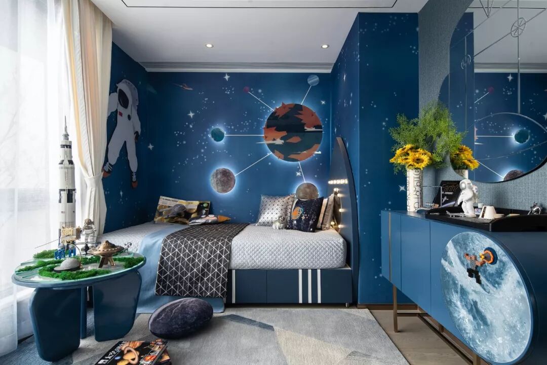 立体的发光星球绘板、穿着航天服的狗狗布偶、UFO、火箭、航天员模型、迷你宇宙基地……设计搭载了一个微缩的宇宙空间,在神秘的星空蓝中,承载起孩童最纯美的喜好与想象。