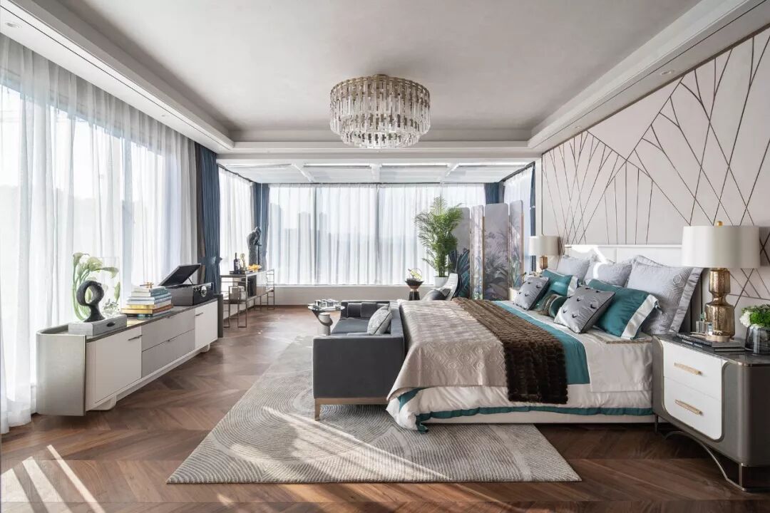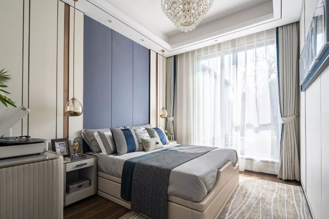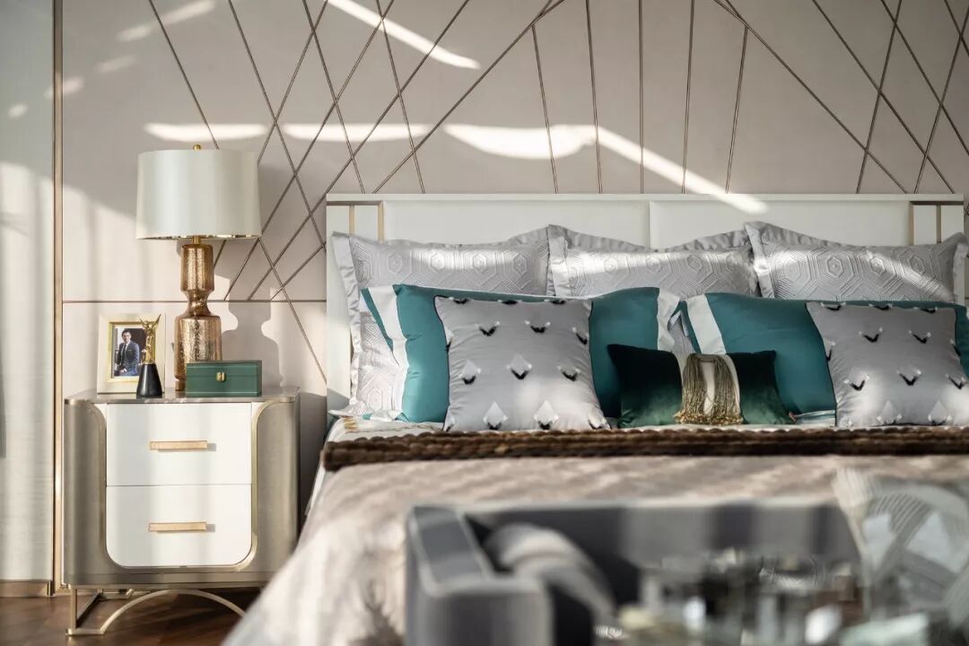 主卧空间色调清中有雅,白灰色与孔雀蓝、典雅棕之间的浓淡搭配相宜。现代设计的简约格调流淌于空间各处,打造静谧、舒适、轻奢、高雅的空间状态,彰显居者的精尚品位。