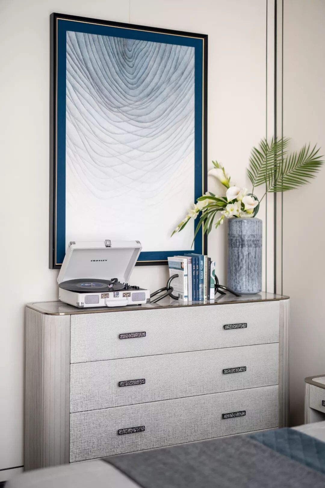 低调的雾蓝色、松软的床品、搭载着经典与记忆的黑胶唱片机……长辈房的设计,在部品的形制细节与空间的气韵营造中,映射出生活的温情与诗意。