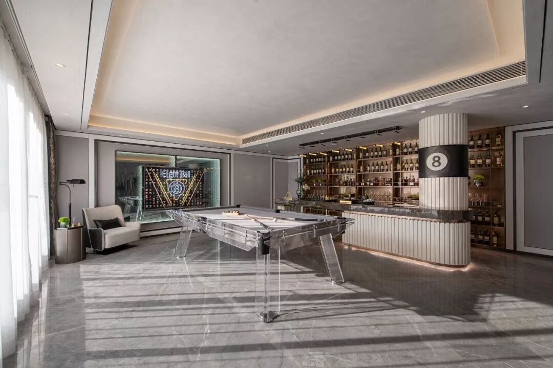 台球桌一改传统样式,以轻盈的亚克力材质构建,呈现简约而时尚的格调。一旁的酒柜陈列着来自不同年代、不同国家的藏酒,舒缓的音乐流于其间,调酒、品酒、对棋、谈趣……组成菁英人士生活情调的一部分。