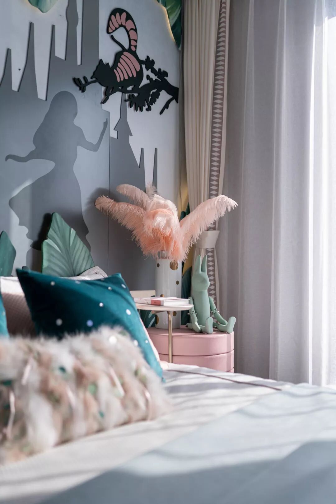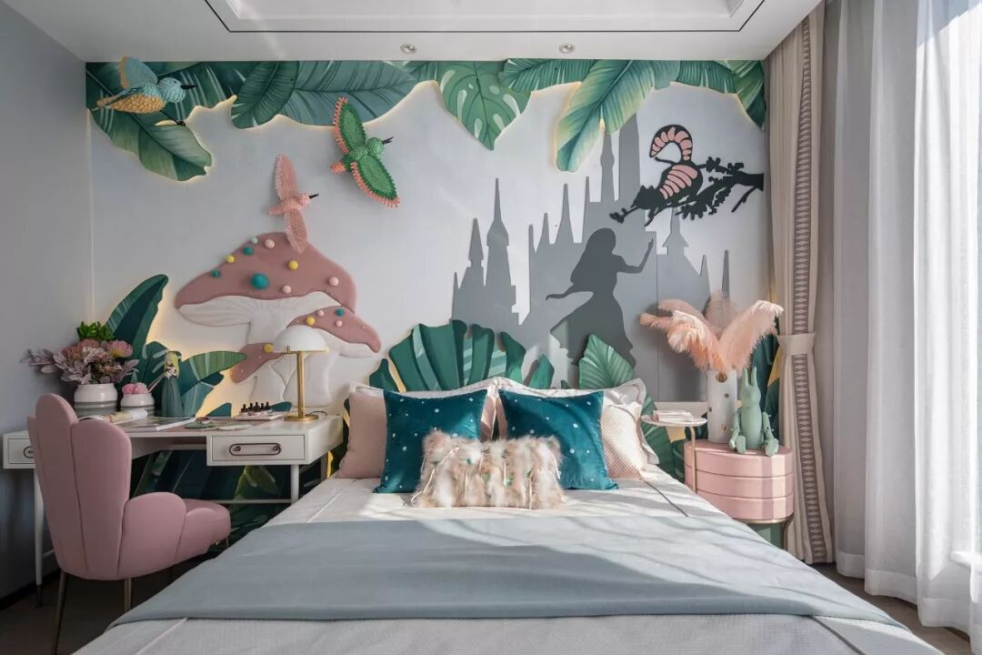 小女孩的房间洋溢着愉悦与趣味的童话梦境。卧室背景墙结合爱丽丝的剪影,运用纸雕艺术与发光半立体绘画搭建了一个奇趣仙境,营造如舞台剧般梦幻的居住氛围。