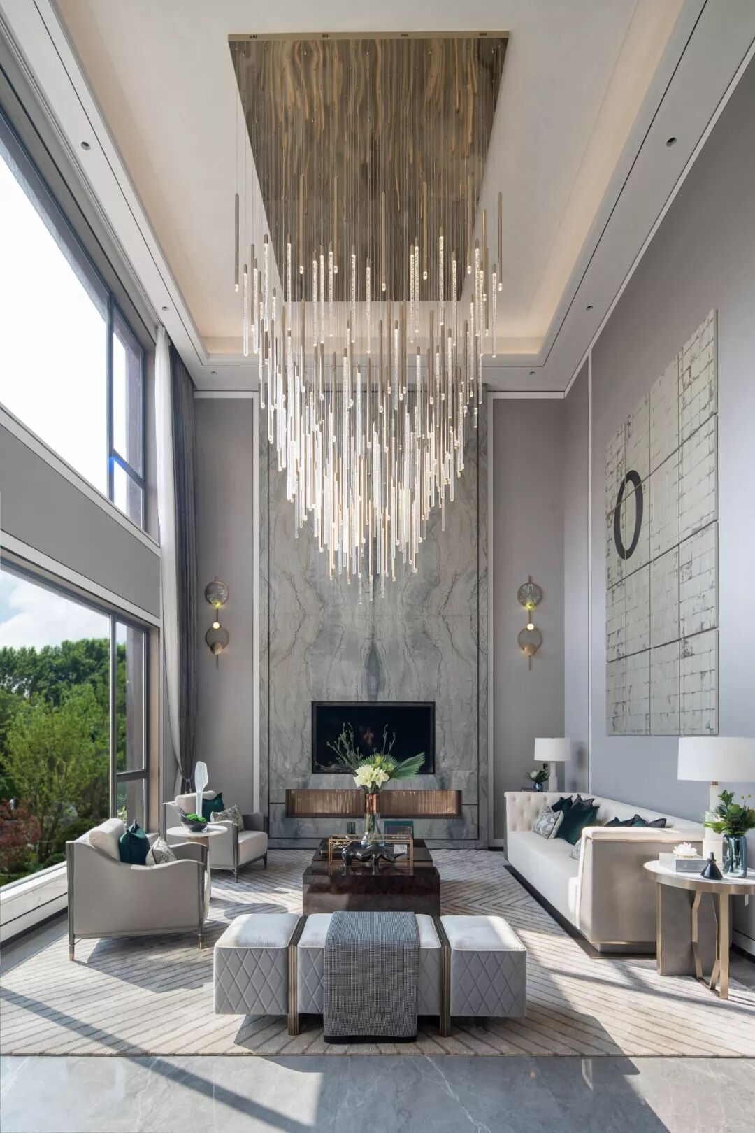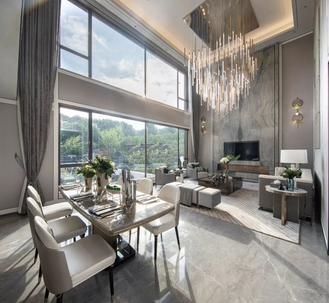 拥有挑高布局与朗阔院景的客餐厅空间,以兼具流丽灵动与璨斓多情的艺术灯饰作为视觉焦点,营造品质臻享、典雅时尚的空间风范。