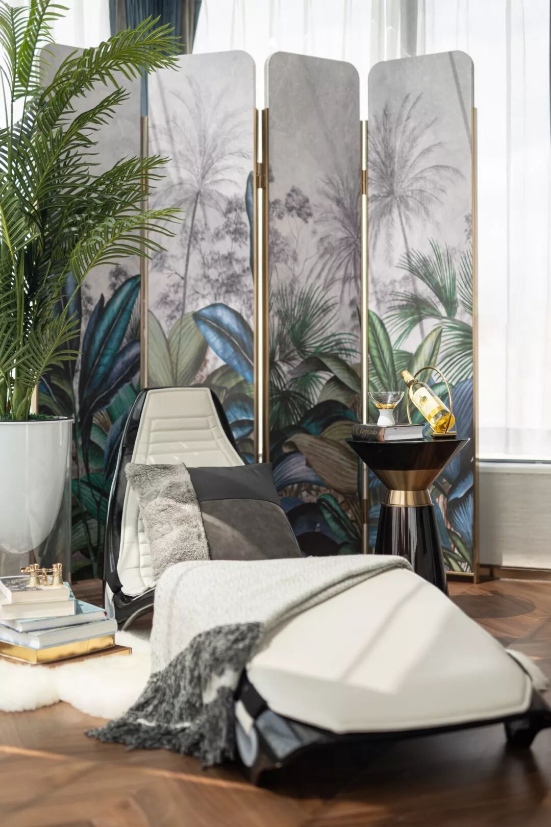 设计将原本的阳台空间一并纳入,营建空间阔绰的尺度感。皮质躺椅、清雅绿植、唯美屏风围合,旭日暖风、几摞书籍、一杯清酒相伴,生活的闲暇时光于此,自在随风,轻盈愉悦。