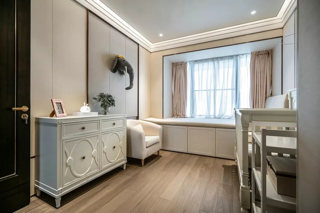 两间婴儿房以淡粉与水蓝作为区隔,配备成对的婴儿床、衣橱,还有一件件童趣别致的玩具。