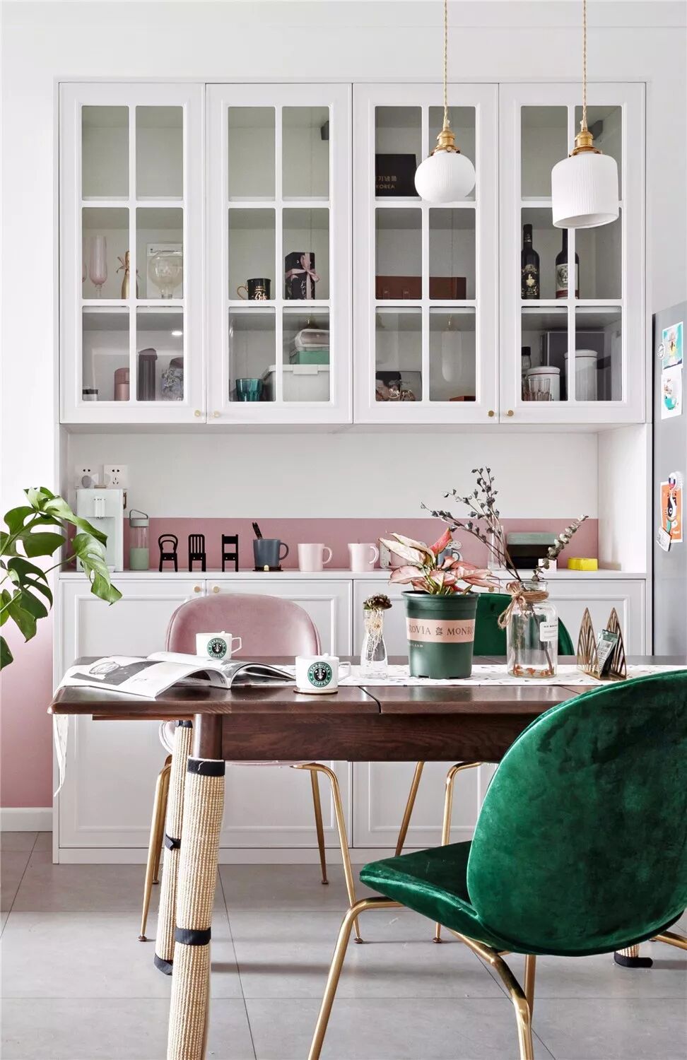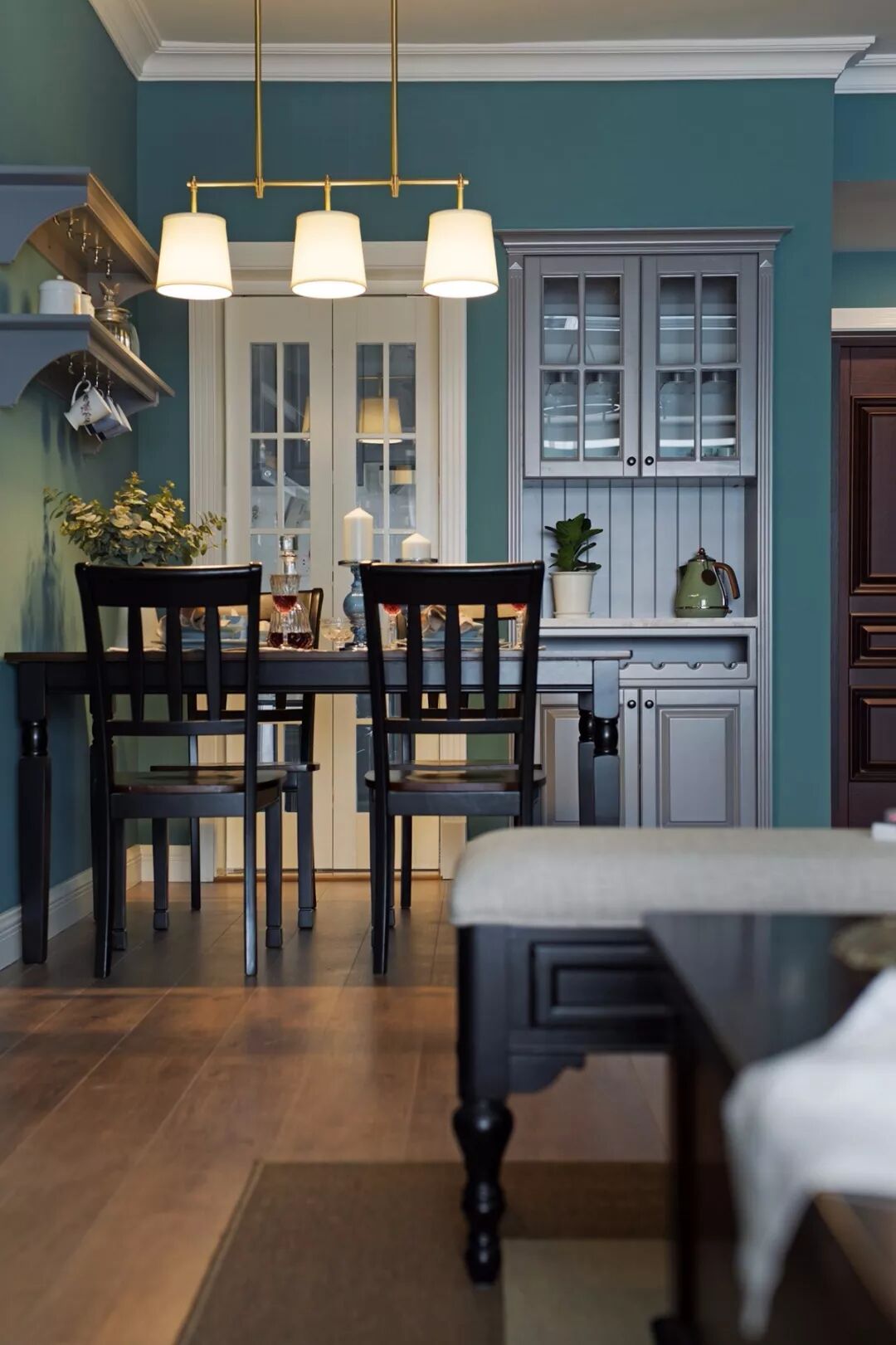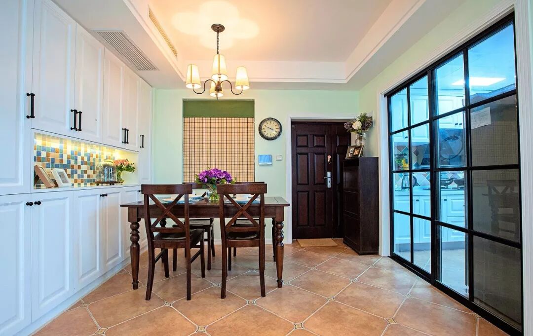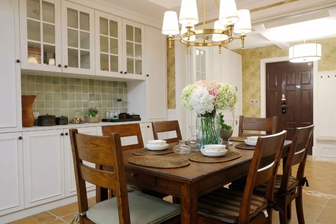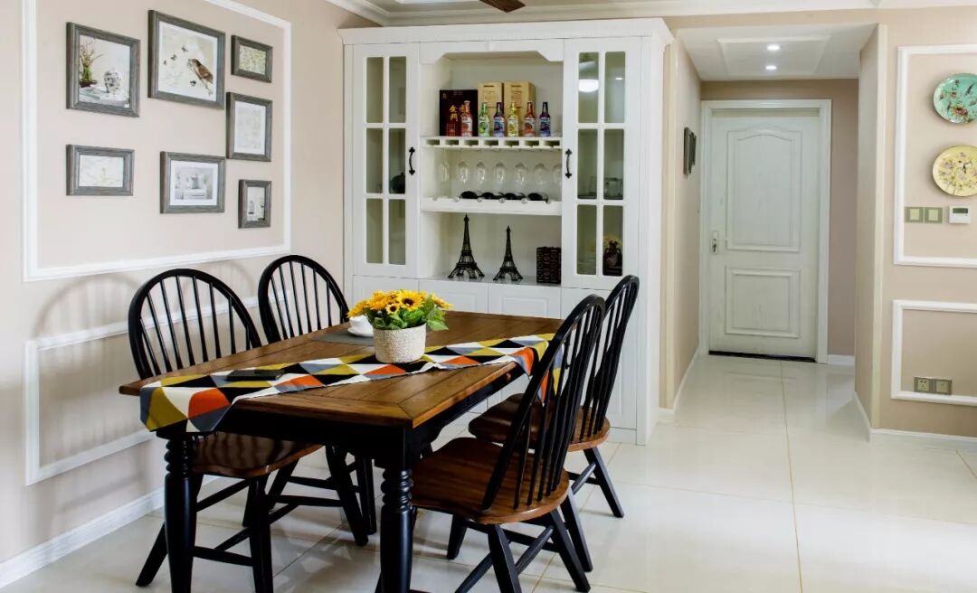 中间留空出空层或展示架,可以作为摆放水壶、水杯的位置,也可以作为花瓶、展示品的格架,增添餐厅空间的实用与优雅气氛。