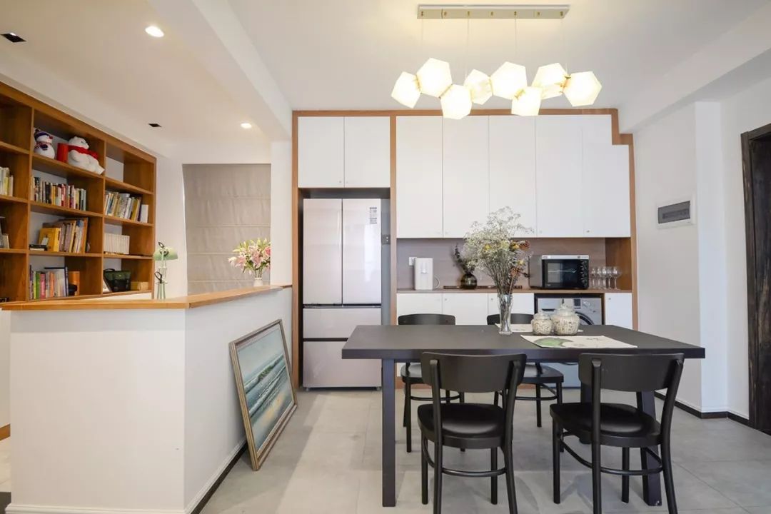 像烤箱、冰箱等电器,如果厨房不方便放的话,也可以放到餐边柜里预留的格架里,整体空间更加丰富实用。