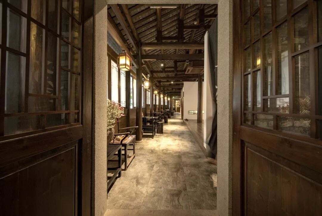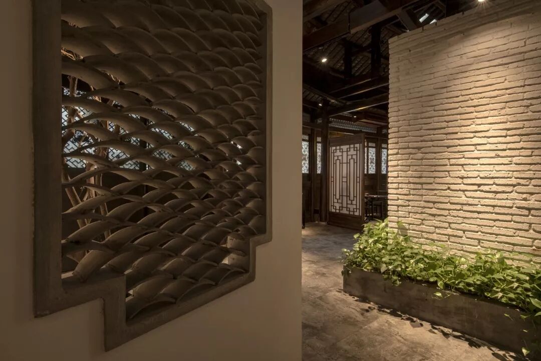 青砖、灰瓦、古木的材质搭配,将自然材质的现代触感表达空间质感,也让顾客有了穿越历史时空的体验。木质间隔门让空间得到充分的间隔与利用,同时划分各种功能分区。徐徐进入,有种远离闹市的安逸感,喝茶、插花、学习古时文人雅事,修身养德,是一门重要的课程。