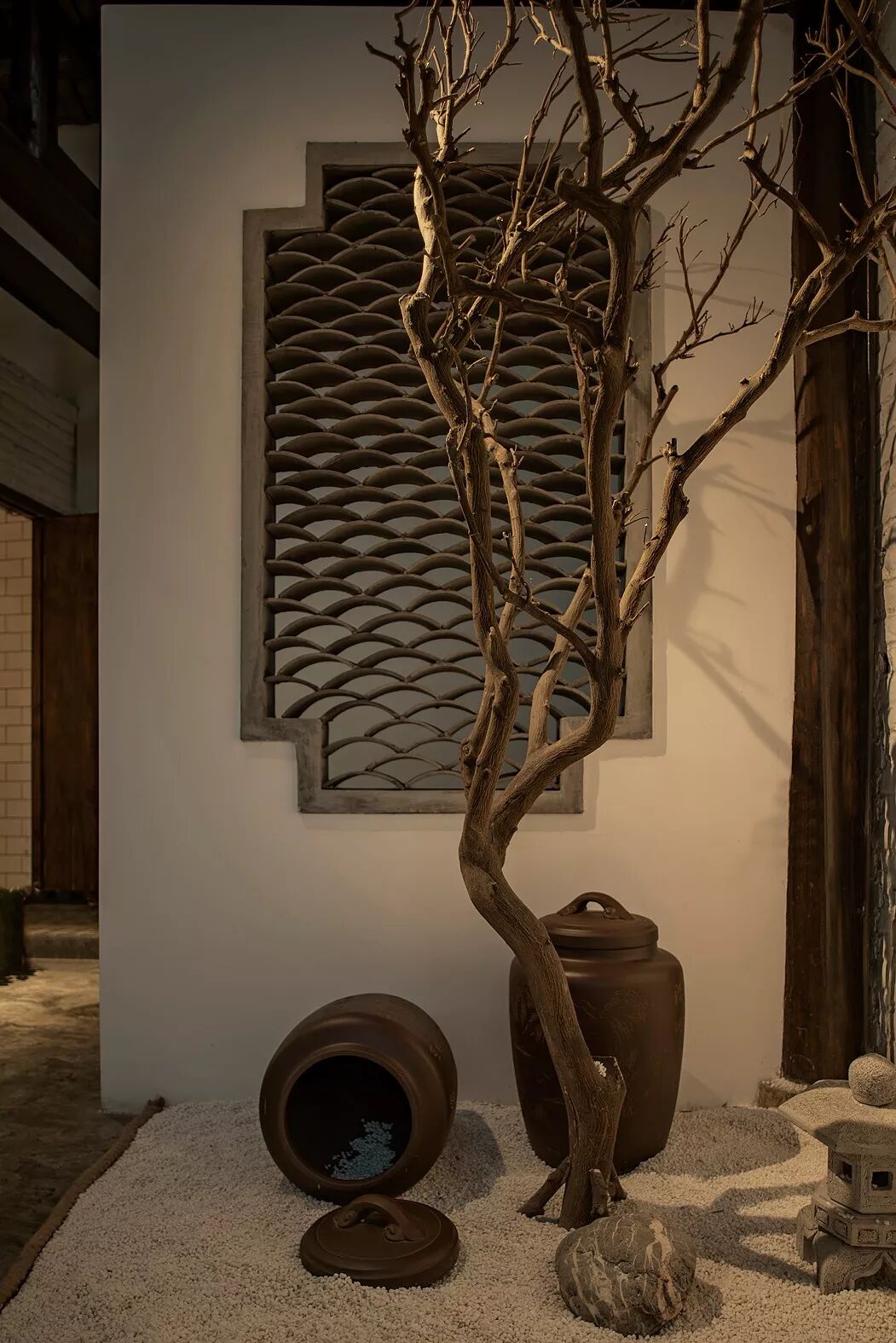 枯枝造景以东方文化为切入点,按照具体情况加以布置,使光影效果别具一格,也展现了独特的意境。