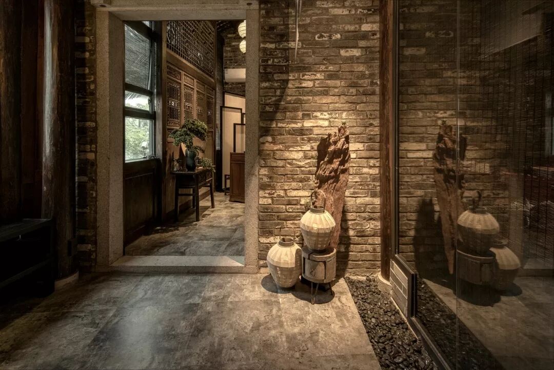 在设计中设计师偏爱木材,运用传统榫卯木结构加上软装的陈列搭建形成空间的序列感,保持原木的素色和清晰的纹理,在砖墙上保留建筑的原本质感,洋溢出一种淡泊、洒脱的景象。