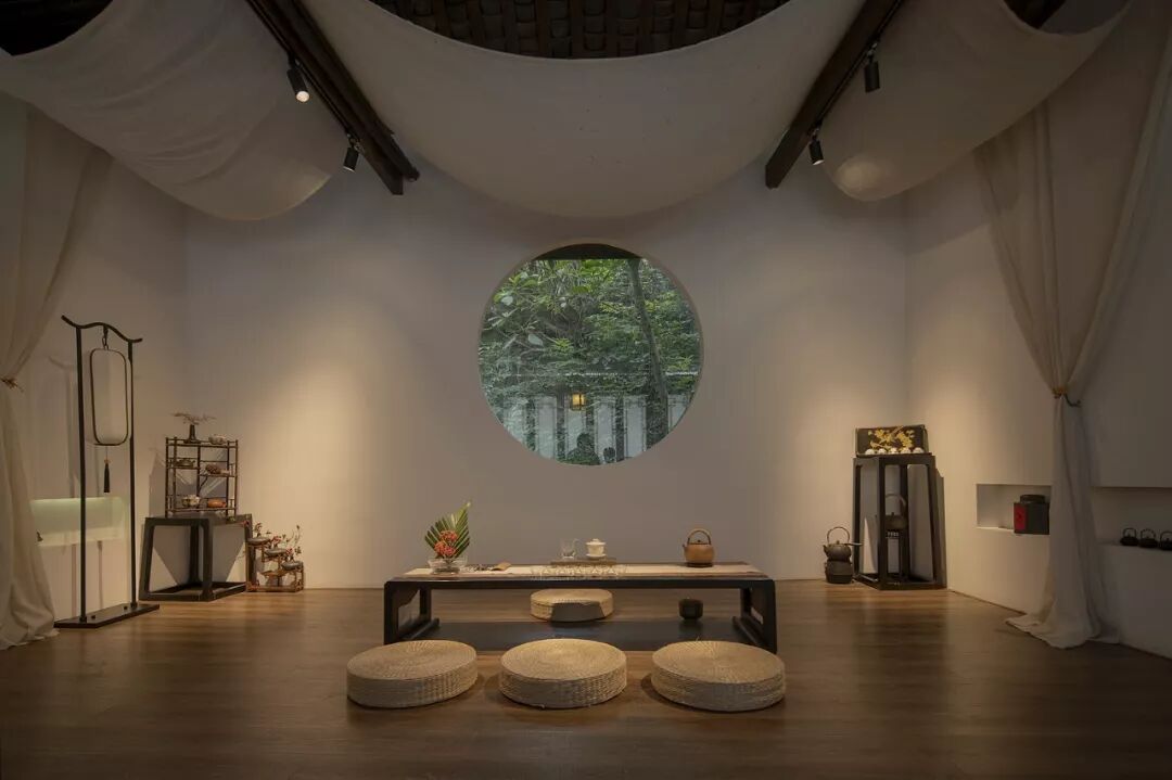 前厅的翠植之后,茶室和表演区一橱窗相连接,中间隔一丝罗,橱窗为盘腿静坐茶室,可景可用,圆窗框一景色,尽显含蓄之美。