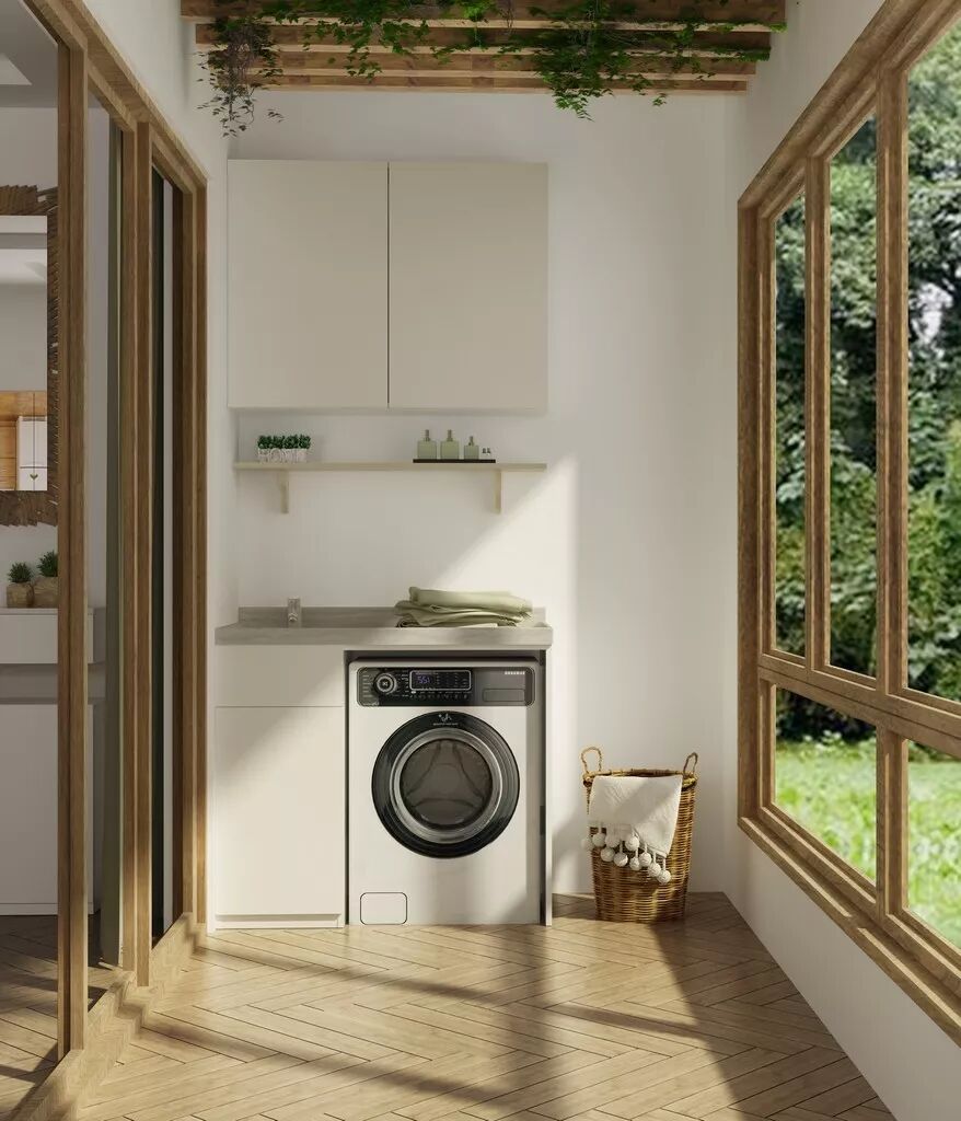 比如家里有独立的小型衣帽间等,里面嵌入洗衣机,熨烫、洗衣、换衣等活动都可在里面进行。