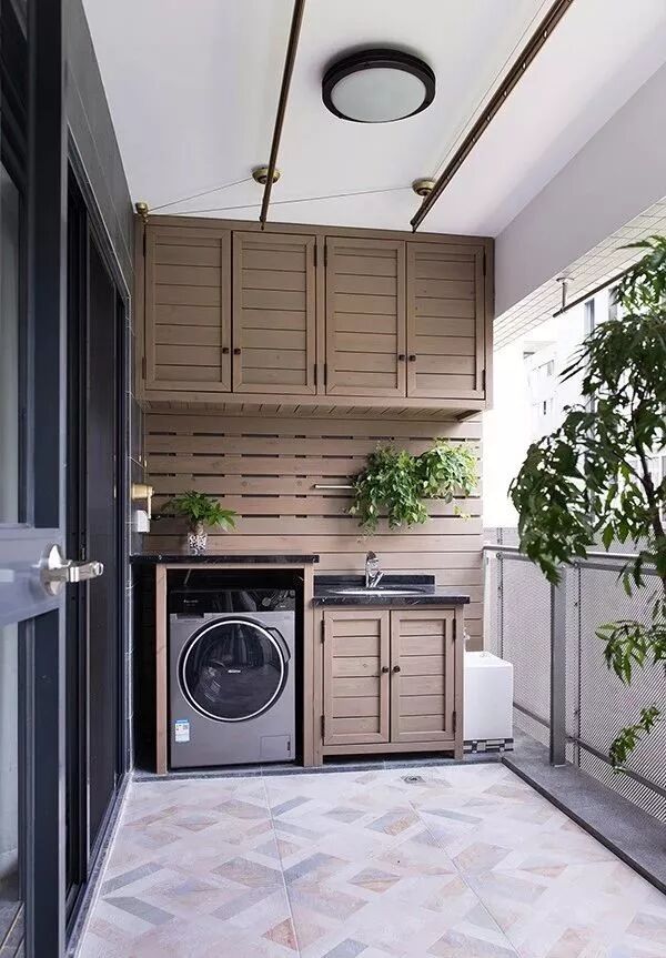 阳台光线充足,晾洗衣物非常方便,而且很多人家阳台配有上下水,洗衣机也顺势放这里,比放在阴暗的卫生间好多了。