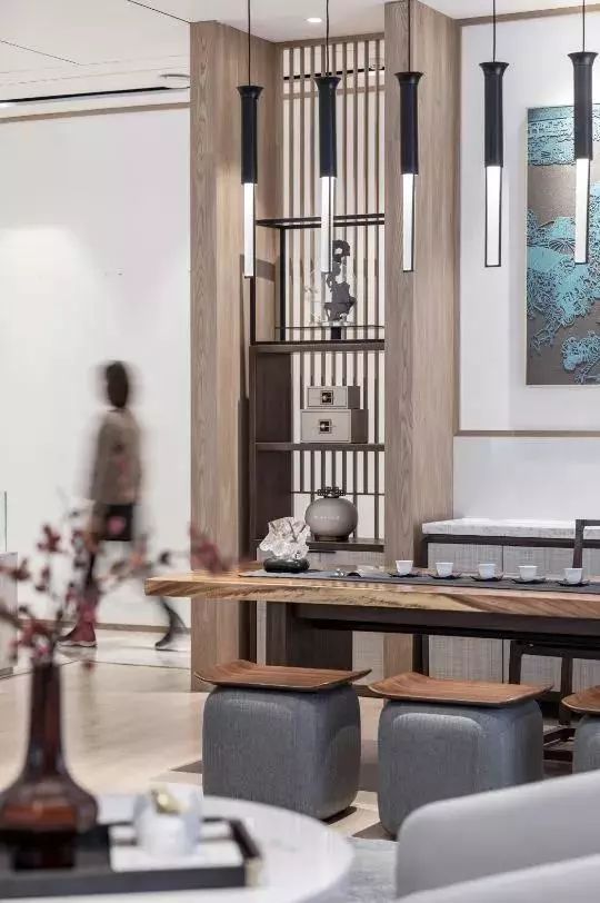 相比传统中式追求富丽堂皇、雕梁画栋的装饰效果,这样的设计相对简洁许多,干脆利落的线条配上简单的装饰元素,不仅突破了传统中式可能过于厚重的诟病,在选材上也更为丰富自由。