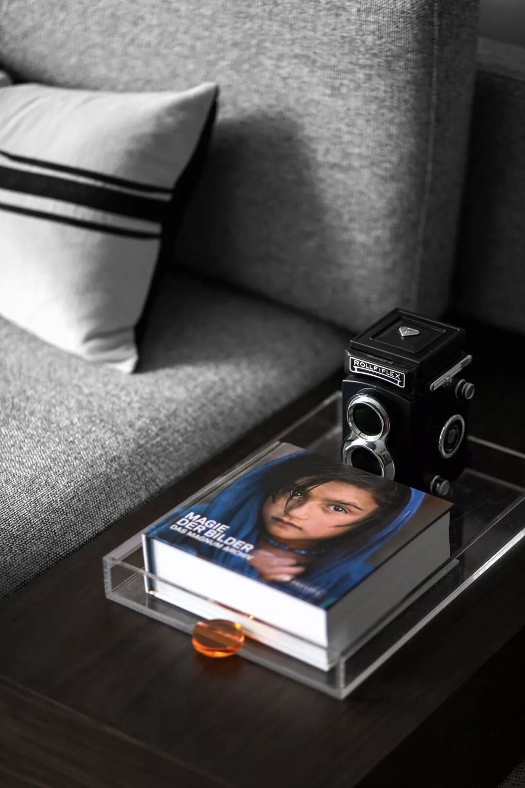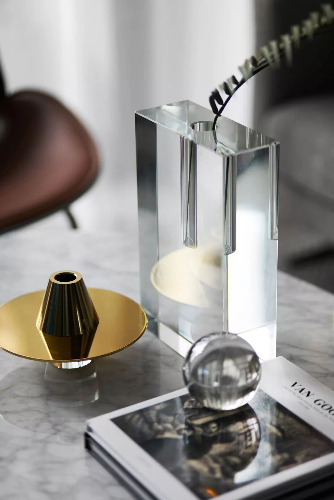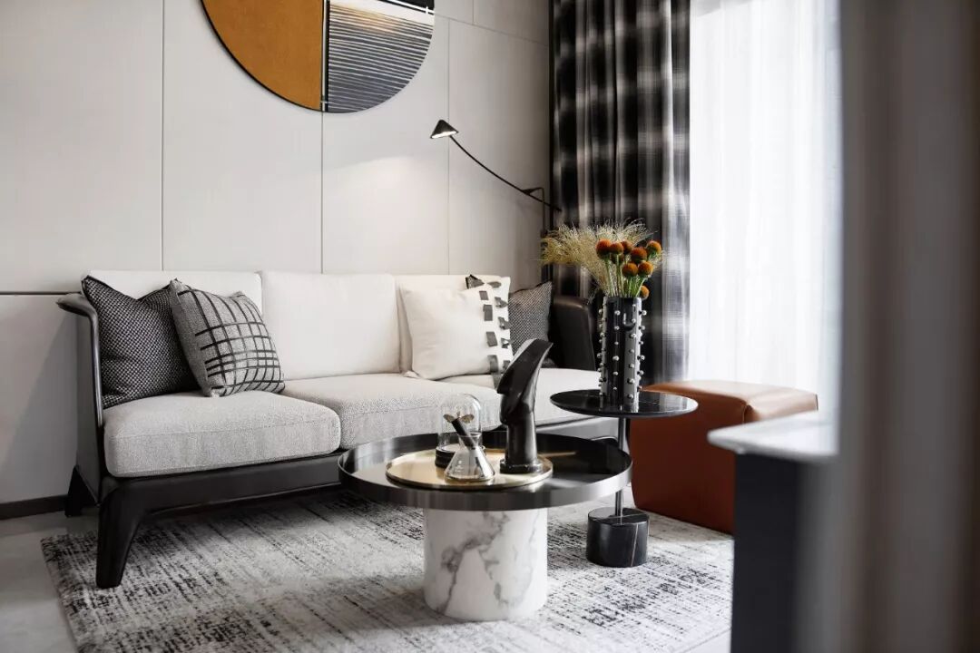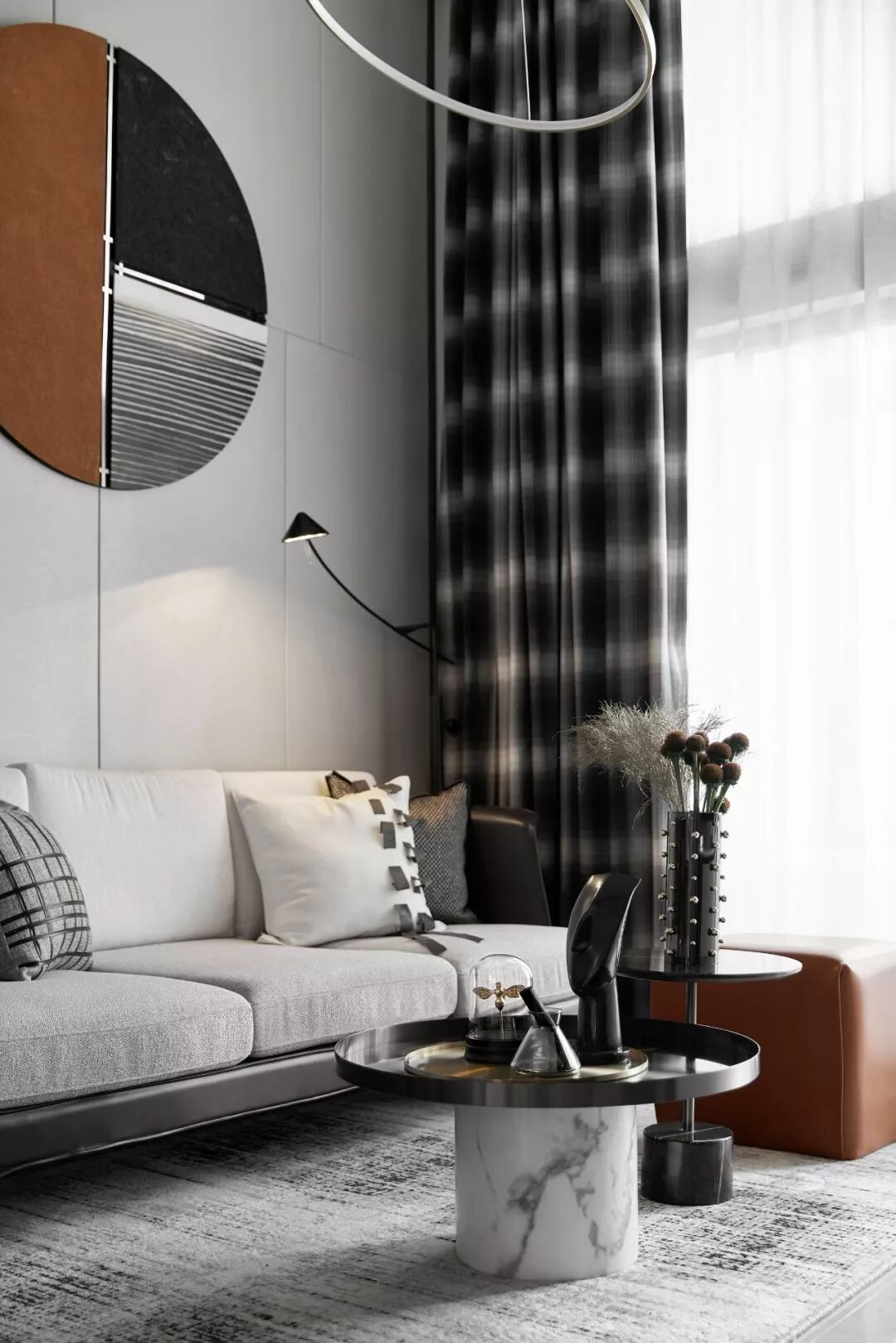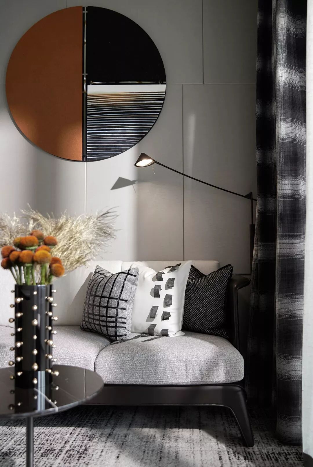 无论是灵动光圈的灯饰,抑或充满层次感的茶几,窗帘上的格纹,甚至是花瓶上的铆钉,都是卸下中规中矩这个枷锁的利器。赤茶色挂画、挂饰与坐凳的加入缓和了强烈的个性,注入温润的气息。