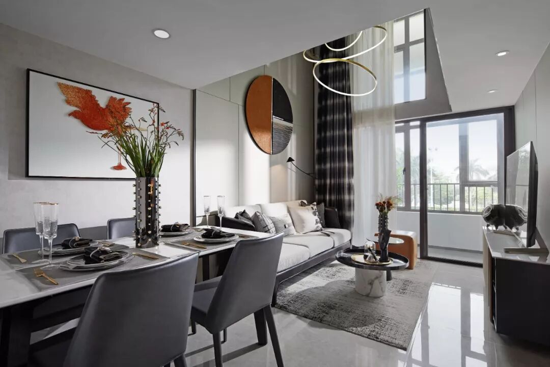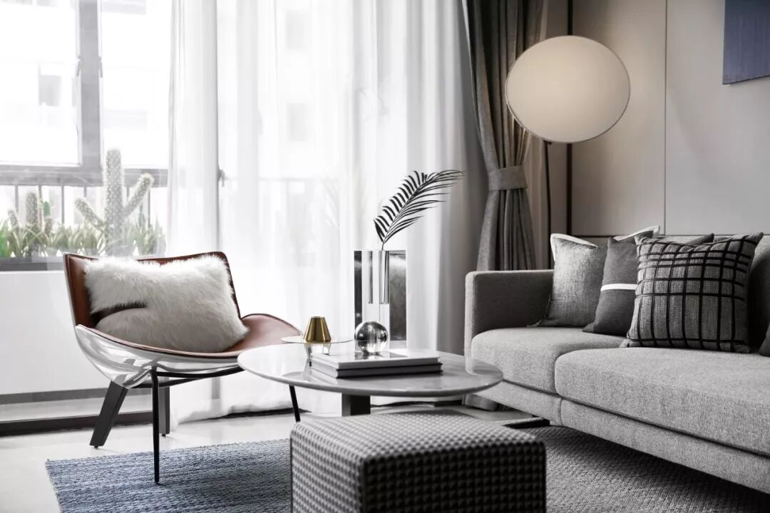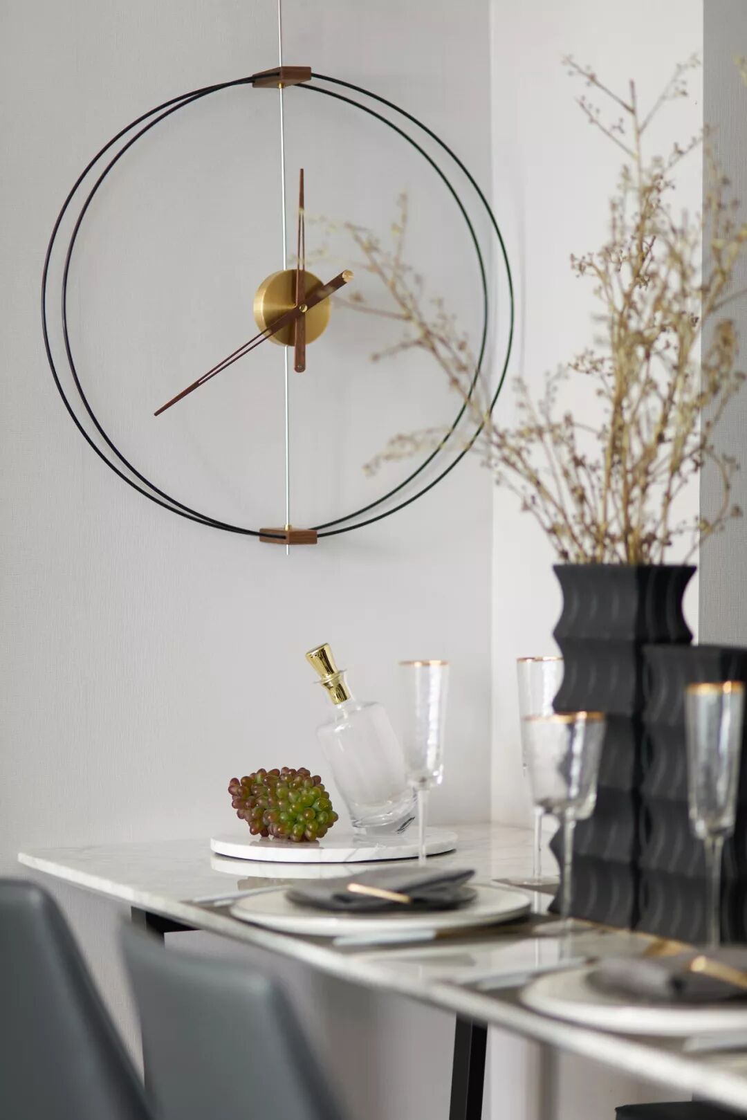 客厅和餐厅以深浅不一的灰色作为主色调,运用明朗的几何线条,在方圆之间自如游走,简约大气的落地灯、茶几与时钟,以圆弧造型形成微妙的呼应。