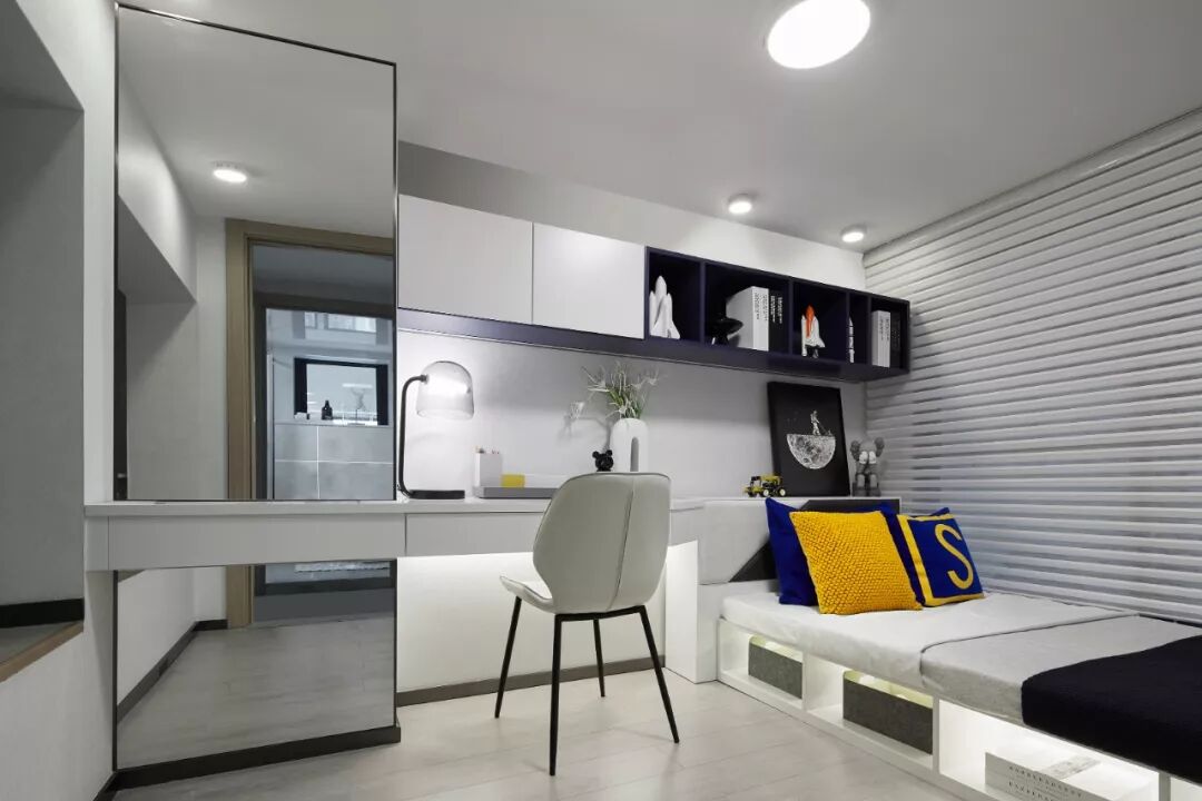 儿童房在大面积白色的基础上,融入了太空蓝和明黄色,如男孩般清爽简单,也如童年——让记忆的幕墙留白,撒下星光烁烁的未来。