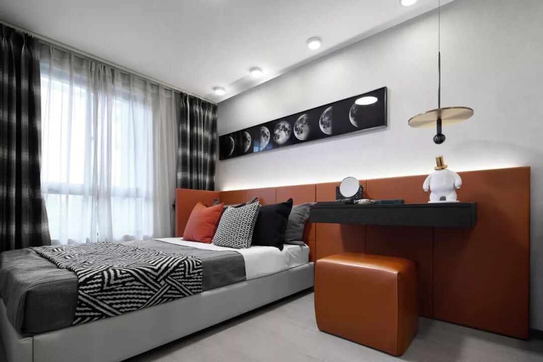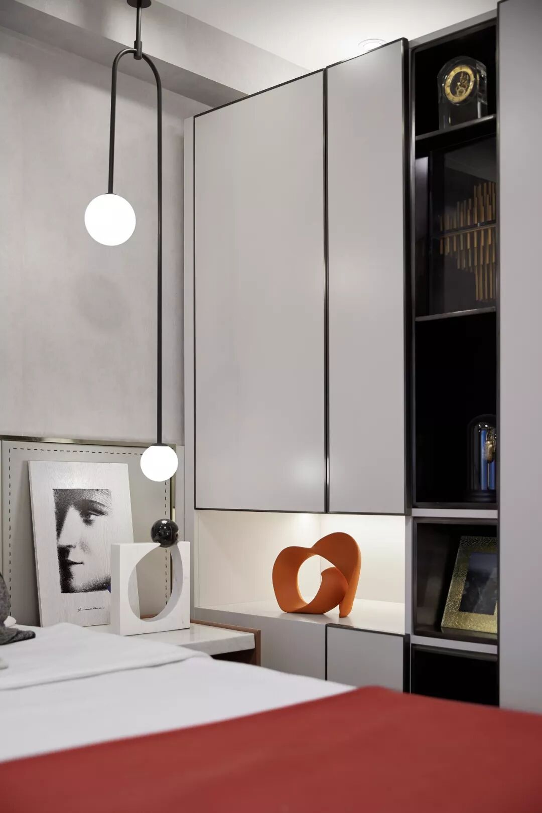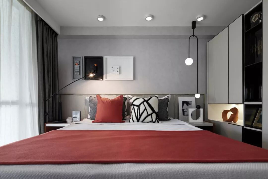 主卧用视觉上跳跃又不刺眼的赤茶色,调动了主色调灰色的沉稳。两处线条简洁却不乏味的灯饰提升了整个空间的律动感,仿佛灯光不是打在床侧,而是心灵的侧面。