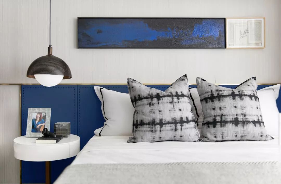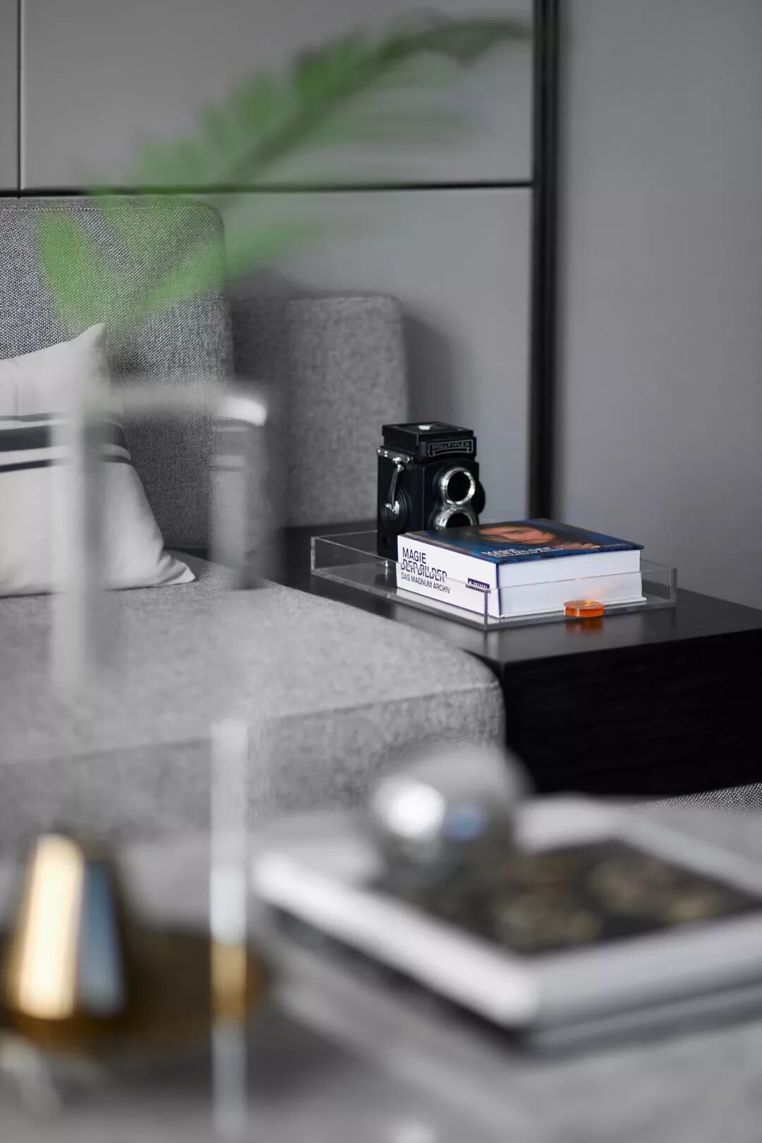 客厅与餐厅的几何线条与色彩搭配,不动声色的延展到了卧室里。在这个隐匿舒适的空间里,不需要过多装饰,除繁就简,足以过滤所有的倦意。