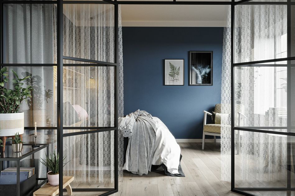 如果卧室有卫生间或者其他功能空间,想互不打扰,有一定的隐私性,但无奈又怕面积不够,影响采光或者居住的舒适度,其实不妨试一试当下非常流行的玻璃+铁框的隔断,通透的隔断不仅能拉高空间高度,让光线不受阻,隔断用简单的线条组成,让不大面积的卧室更富有个性和格调。
