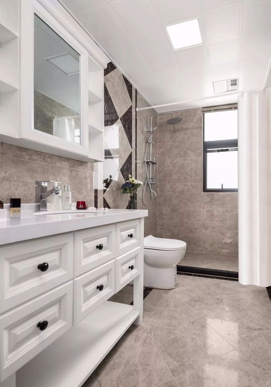 ▲ 卫生间整体通铺现代感的咖啡色瓷砖,搭配白色成品台盆柜与镜柜