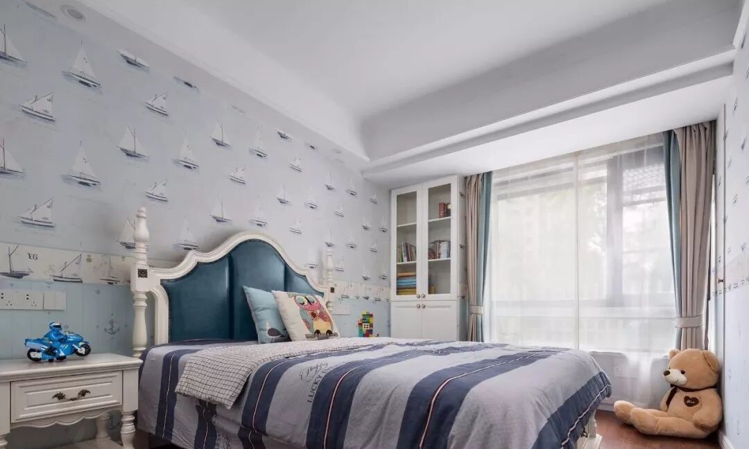 ▲ 儿童房,木纹地板搭配拼色帆船壁纸,浅蓝基调的空间创造明亮轻松的就寝环境
