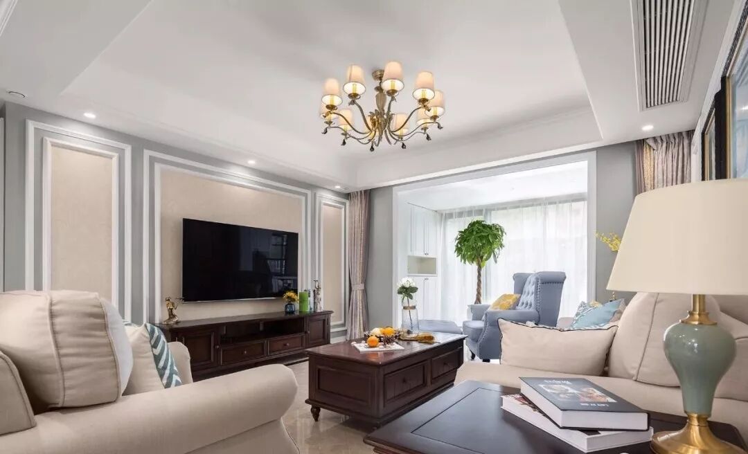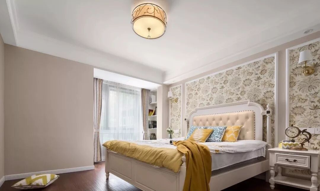 ▲ 主卧,采用金色壁纸铺贴床背景,用白色线条勾勒造型,搭配柔和浅奶咖色墙面,营造温馨柔和的就寝环境