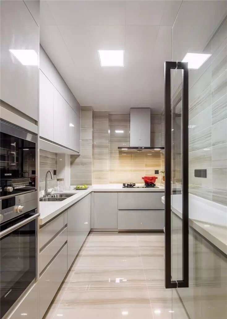 厨房,这一空间较为特殊,上班族使用的话,一般只在夕阳西下、华灯初上之时,厨房的灯光设计更为重要。操作台之上一般都设有一排柜子,方便收纳的同时,也影响了视线,可以在操作台上方安装小灯带。