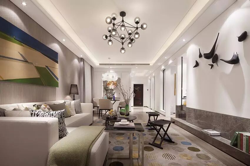 客厅中间需要一盏能够照明且装饰效果较强的灯具,大多数人会选择大吊灯,四周再装一圈隐藏在吊顶中的筒灯。小编温馨提示:大吊灯和四周的筒灯最好分组安装,使用不同的开关,如使用同一开关太亮,长时间使用后容易刺伤眼睛。