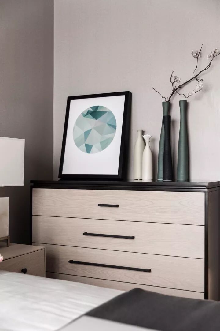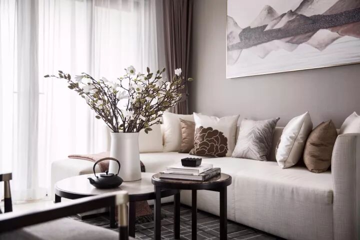 以沉静稳重的灰褐色色调与新中式元素相融合,体现出整个空间中流露几分温婉秀雅的东方情怀。不仅反映出现代人追求简单生活的居住要求,更迎和了对家居设计风格的内敛、质朴,使新中式风格更加实用、更富现代感。