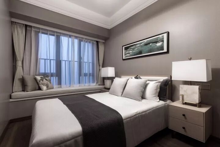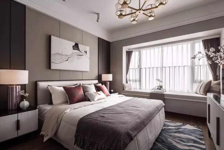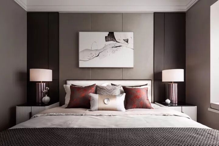 在卧室的设计上,运用简洁明快的设计风格。床品则选择浅色调,点缀些许红色抱枕+深色搭毯,增加层次感,优雅而时尚,可以令视线进退得宜,打造舒适观感,演绎出典雅和华贵气息。